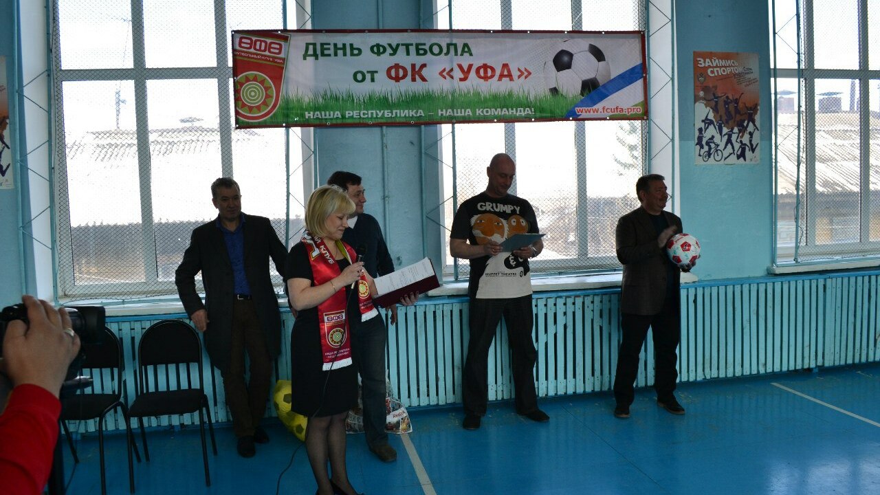 От Совета учредителей ФК «Уфа» президент клуба вручил школе футбольные мячи и пригласил всех на последний домашний матч первенства ФНЛ-2013/2014 между «Уфой» и «Нефтехимиком», который состоится 11 мая в 17:00 на стадионе «Динамо».