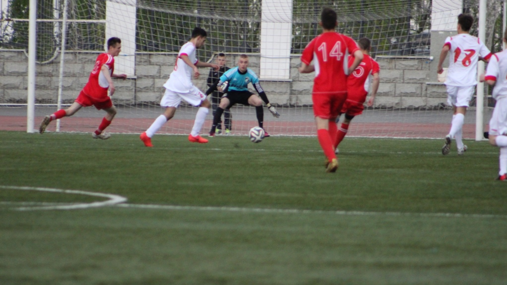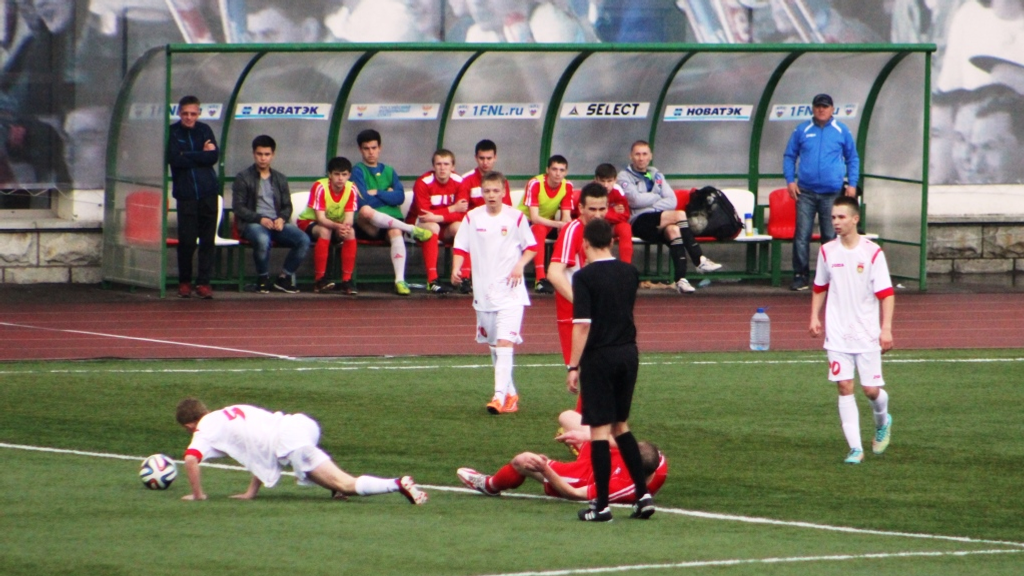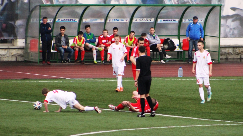 Туймазинцы начали осторожно, предпочитая ловить молодых подопечных Дамира Давлетова на острых дальних передачах в их тыл. Одна из атак на 15-й минуте завершилась голом Вадима Лазнова. Концовка тайма прошла под накрывшим Уфу дождем, но ворота красно-белых остались «сухими».