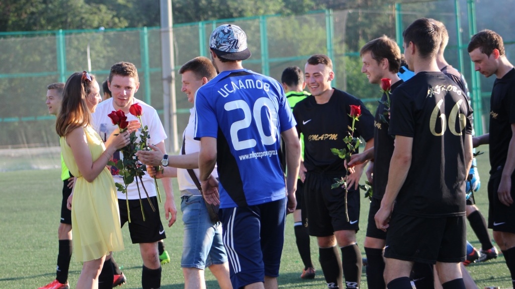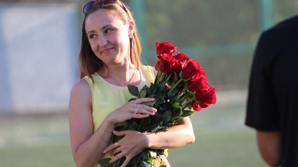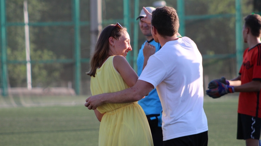 Почему внимание? Да потому что после 14:0 и финального свистка еще одно кольцо появилось на стадионе. Оно, из игроков «Старта» и «Динамо», двинулось в сторону трибуны, где сменивший свою черную рабочую футболку на белую с надписью «Выйдешь за меня?» сиял Динар.
