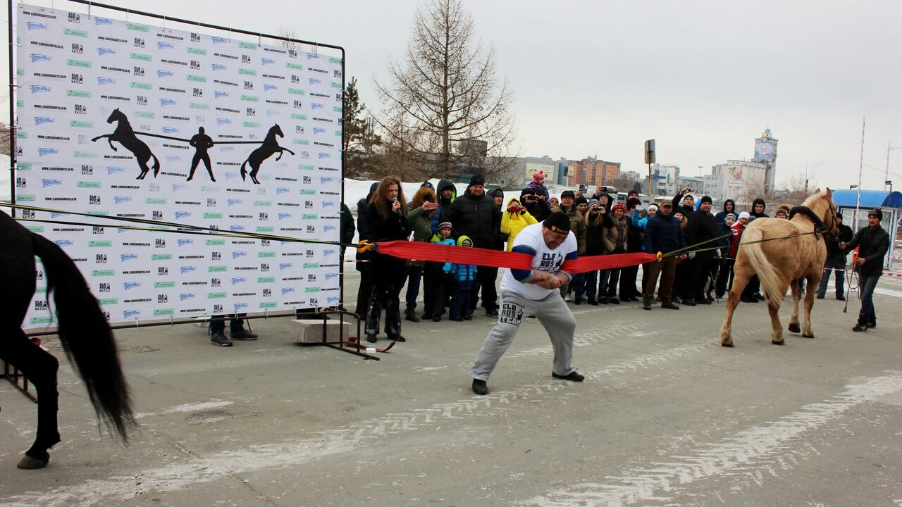 УФА, 4 мар 2016. /ИА «Башинформ», Арина Рахимкулова/. Башкирский стронгмен Эльбрус Нигматуллин померился силой с двумя лошадьми. В несколько подходов силач повторил номер, который не выполнялся уже более века.