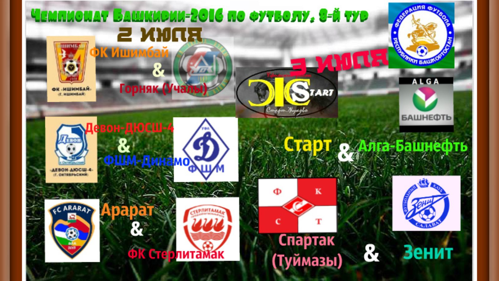 УФА, 2 июл 2016. /ИА «Башинформ», Дмитрий Слезин/. В чемпионате Башкирии-2016 по футболу 2-3 июля будет сыгран 8-й тур. В нем сойдутся в личных противостояниях команды первой шестерки.
