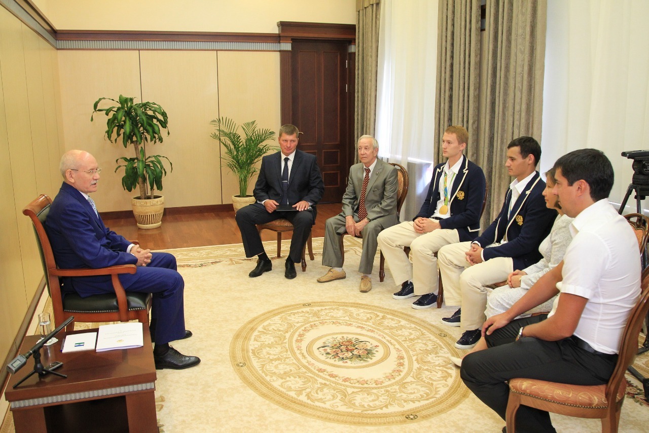 УФА, 17 авг 2016. /ИА «Башинформ», Александр Смирнов/. 17 августа в Доме Республики Глава Башкортостана Рустэм Хамитов встретился с чемпионами XXXI летних Олимпийских игр, рапиристами Тимуром Сафиным и Артуром Ахматхузиным, а также их тренерами Рамилем Аюповым, Лирой Грушиной и Русланом Насибуллиным. Обсуждались перспективы развития фехтования в республике, укрепления материально-технической базы этого вида спорта.