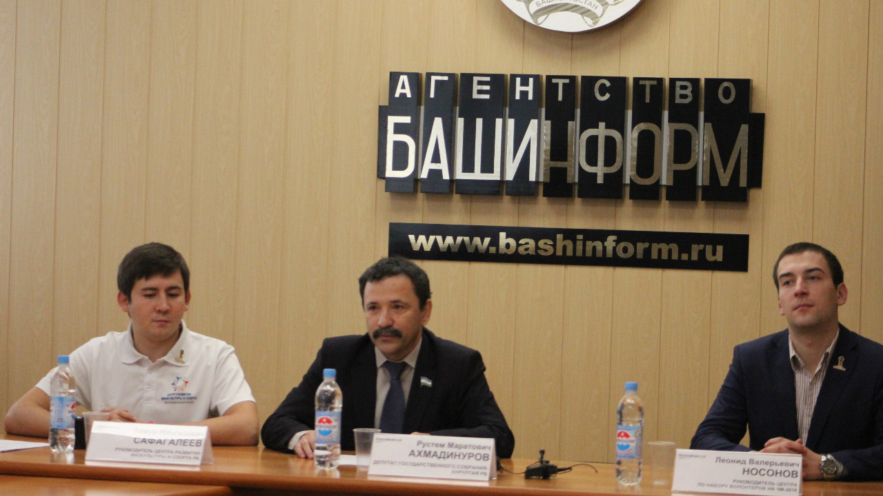«Сегодня к нам в республику приехал руководитель Центра по набору волонтеров на чемпионат мира-2018 по футболу Леонид Носонов. Мы планируем встретиться с руководством мэрии города, провести «Уроки футбола» в ведущих вузах, в частности, в Башгосуниверситете, флешмоб «Запуск мяча» и подписать соглашение по открытию филиала волонтерского центра - Центра развития физкультуры и спорта Республики Башкортостан, который будет вести работу по подготовке волонтеров», - сообщил журналистам депутат Госсобрания РБ Рустем Ахмадинуров.