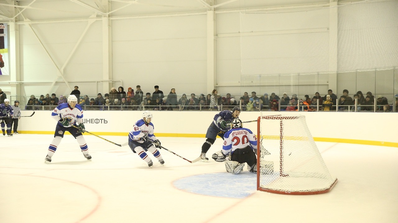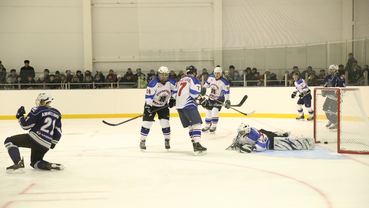 После символического вброса шайбы на арене состоялся матч между местными хоккейными командами «Строитель» и «Алга-Башнефть».