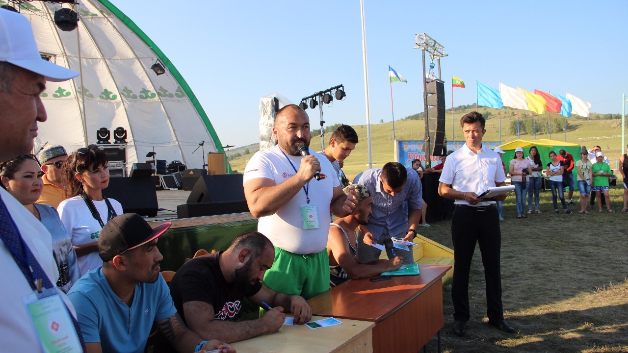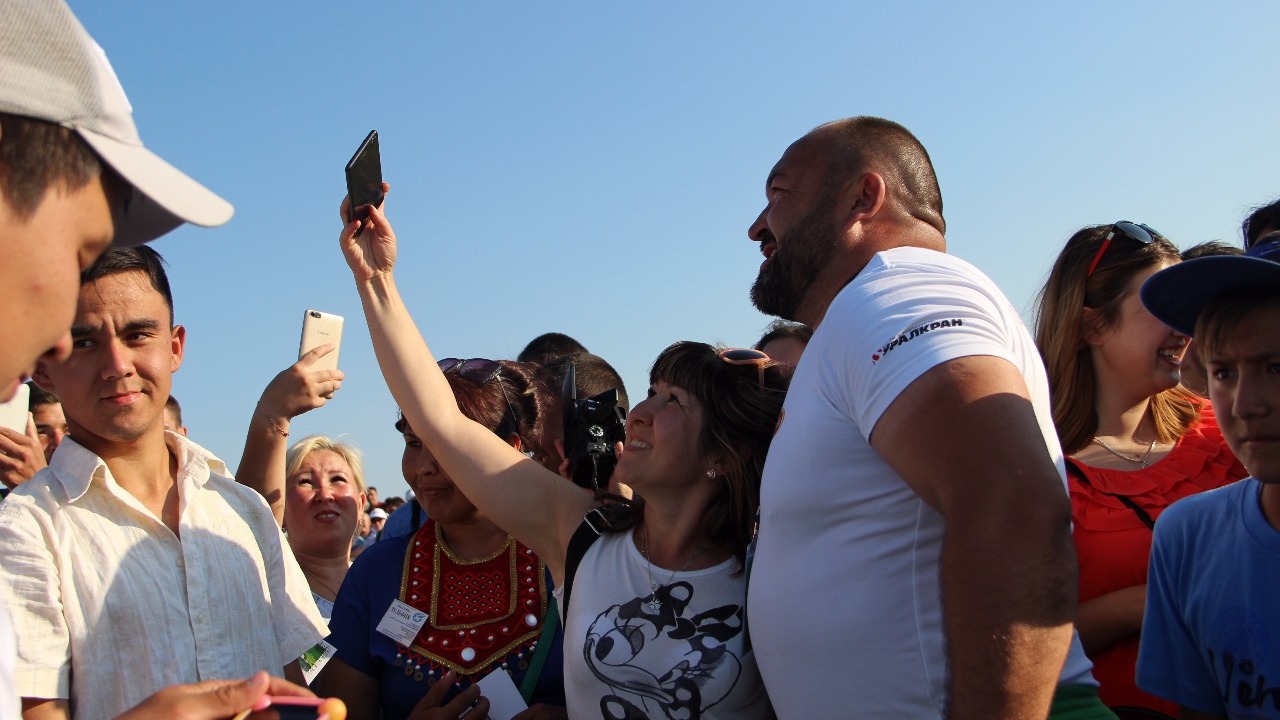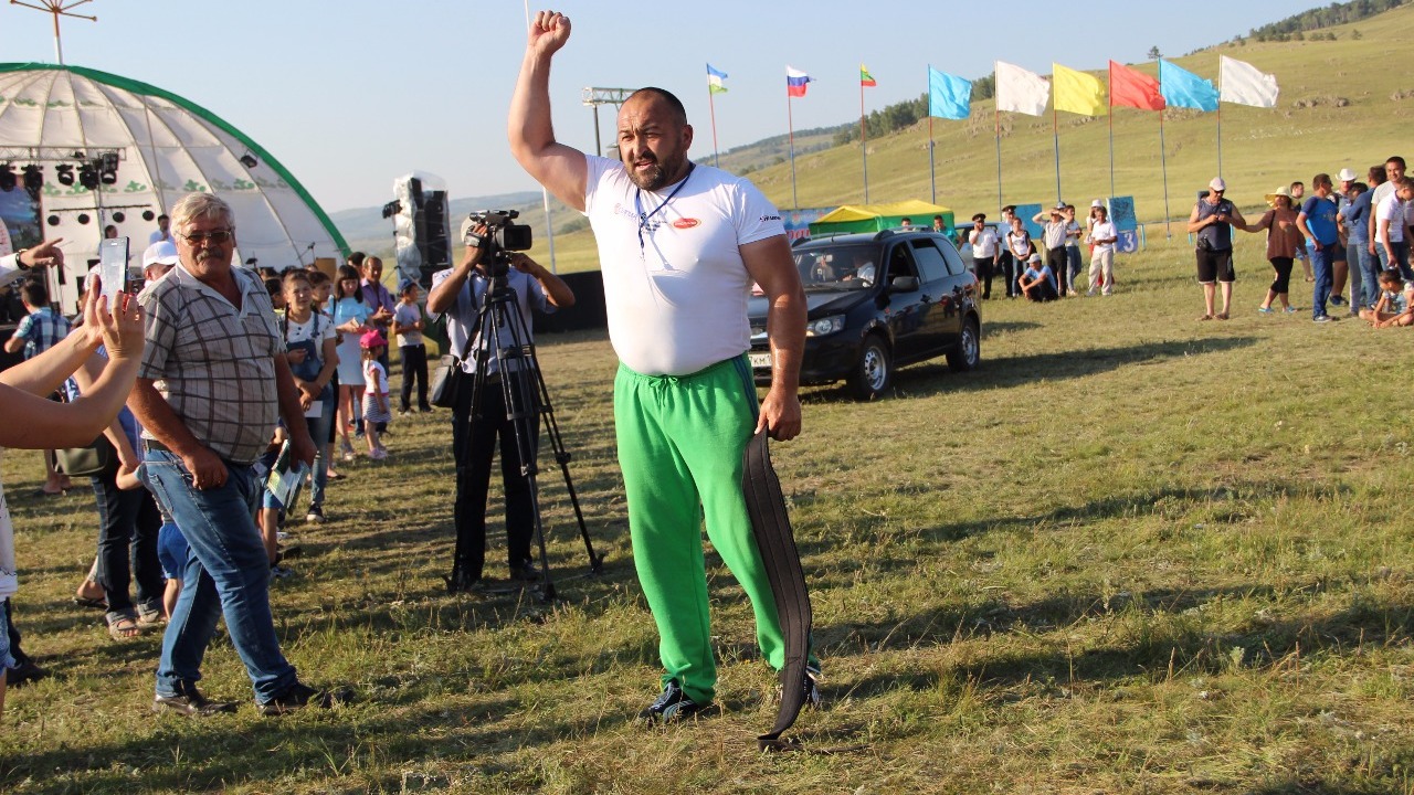 УФА, 30 июл 2017. /ИА «Башинформ», Дарья Петрова/. В субботу, 29 июля, знаменитый силач, мастер спорта по паурлифтингу и армрестлингу Эльбрус Нигматуллин провел мастер-класс для жителей Башкирии, а вместе с этим рассказал и о новом мировом рекорде, который собирается поставить в ближайшее время. Встреча со знаменитым спортсменом стала возможна в рамках Йыйына башкирской молодежи, который прошел на Графском озере в Баймакском районе республики.