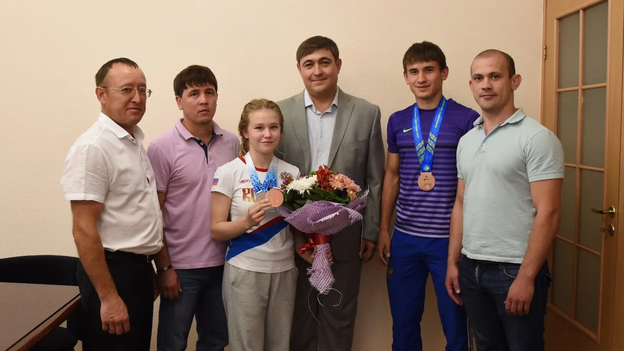 УФА, 9 авг 2017. /ИА «Башинформ», Алим Фаизов/. В администрации Туймазинского района глава муниципалитета Айдар Суфиянов встретился с местными спортсменами - Лилианой Салимьяновой и Марселем Закировым. Они прославили город и район, выиграв соревнования регионального, российского и международного уровней.