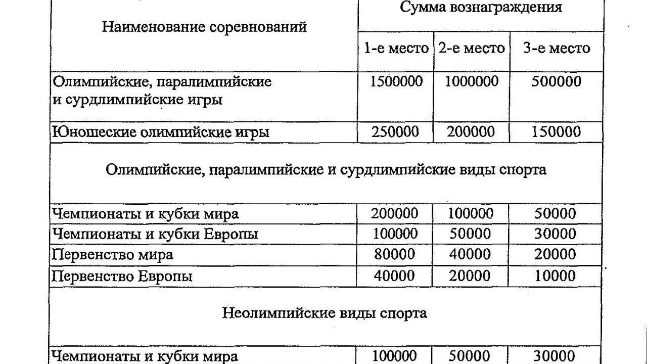 Тренеру спортсмена, участвовавшего в летних и зимних Олимпийских, Паралимпийских, Сурдлимпийских и юношеских играх, чемпионатах, кубках, первенствах мира и Европы и завоевавшего одно или несколько призовых мест, вознаграждение назначается в размере 50% от размера материального поощрения в денежной форме, полученного спортсменом.