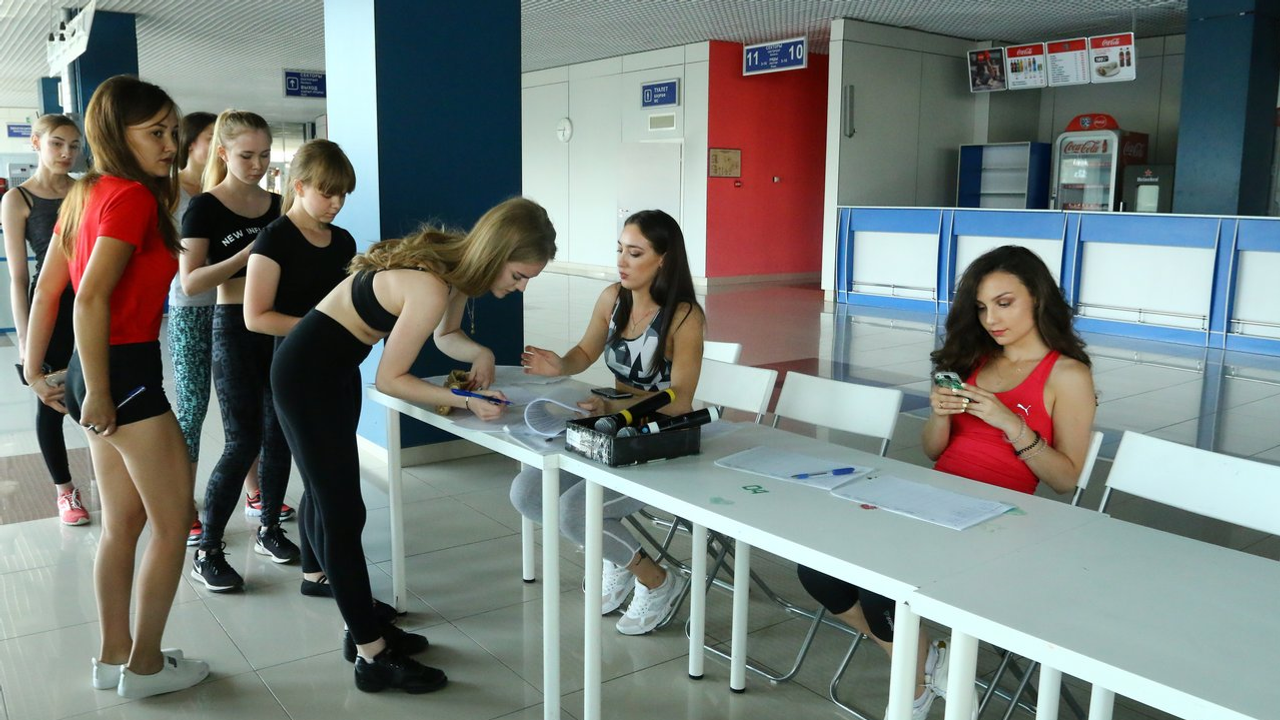 УФА, 27 июн 2018. /ИА «Башинформ», Наталья Овчарук/.Почти 80 девушек заполнили холл «Уфа-Арены» ради одной цели — попасть в группу поддержки. Последние приготовления: заполнение анкеты, получение своего номера, растяжка, повторение заученных движений и вызов на сцену.