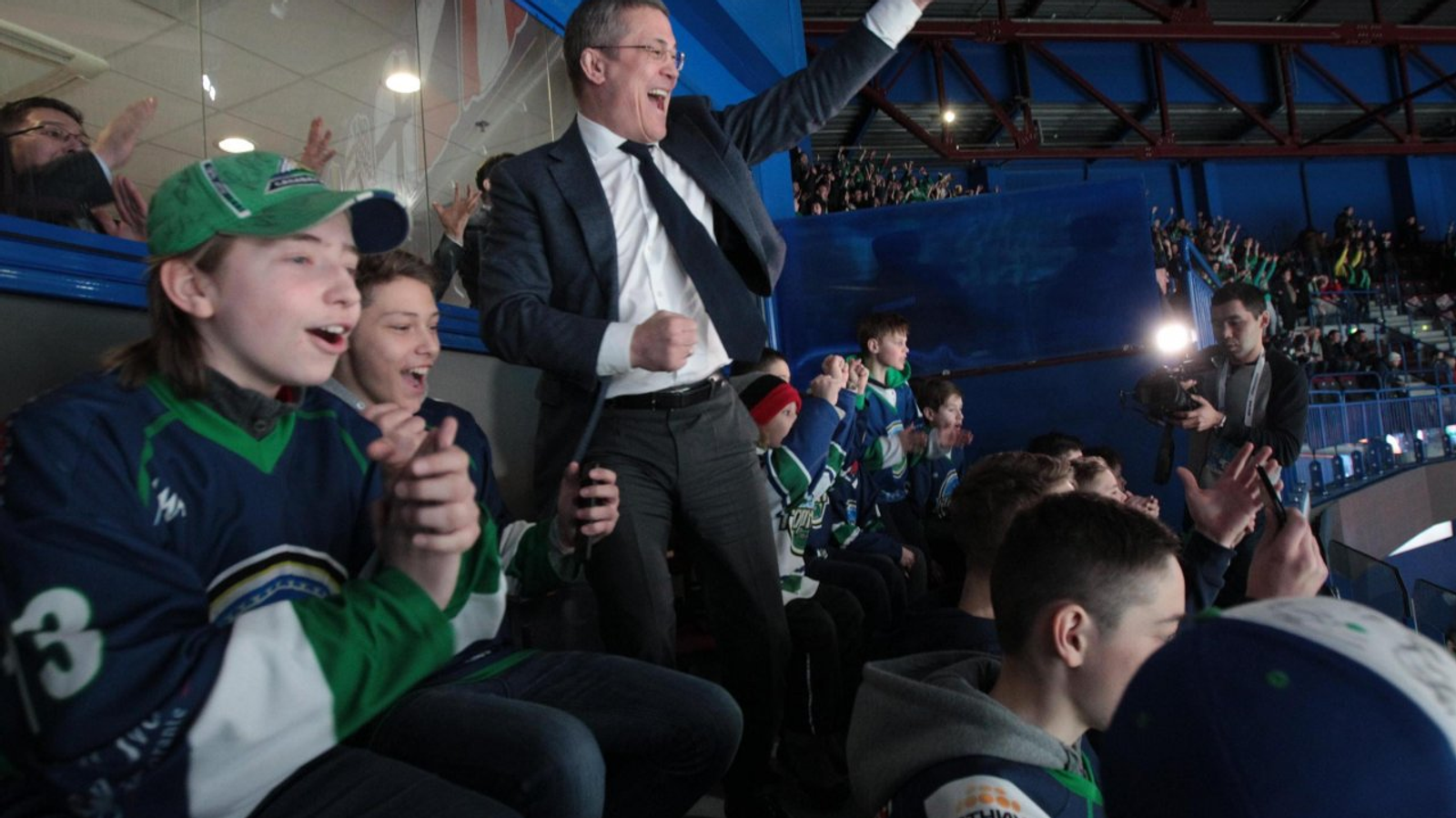 Радий Хабиров смотрит хоккей на магнитогорской арене вместе с юными воспитанниками сибайского хоккейного клуба «Горняк».