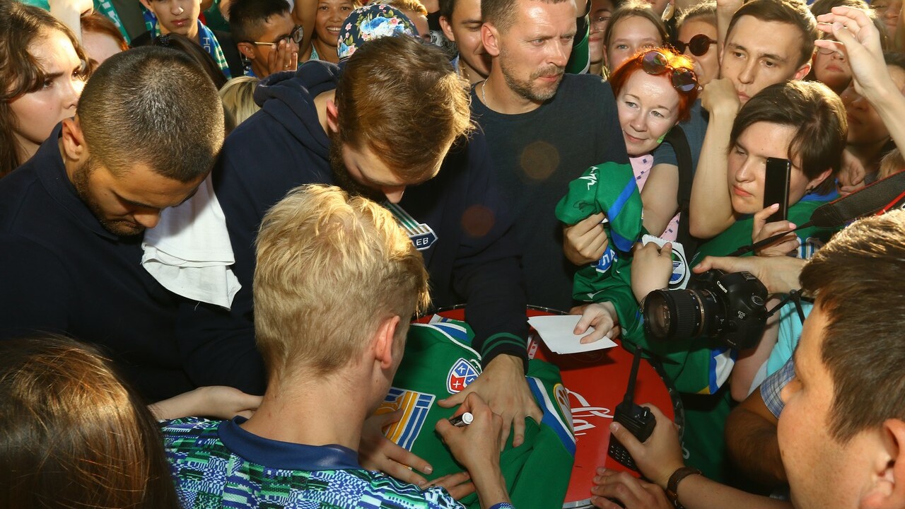 Самая большая очередь за автографами и селфи собралась у Юхи Метсолы - лучшего вратаря КХЛ прошлого сезона. Финский голкипер планировал сыграть пару треков в зоне барабанов, но, по всей видимости, до них он не добрался. Александр Кадейкин встречал болельщиков около клубного автобуса, куда мог зайти каждый желающий и посидеть на месте своего кумира и заодно отдохнуть от изнуряющей жары под кондиционером. Вячеслав Солодухин тихо и мирно раздавал автографы и фотографии в зоне регби.