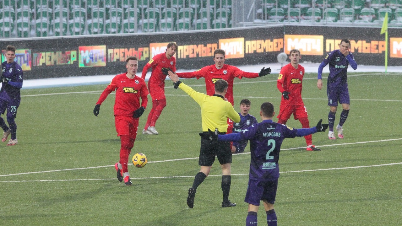 Первые 25 минут гости практически не могли выбраться из своей зоны. Уже на 9-й минуте башкирская команда заработала выгодный штрафной. Кротов потащил мяч к чужой штрафной и прямо перед ее линией завалился на газон, уже потеряв снаряд. Шахов ударил по ноге оппоненту, нарушив правила. Хороший розыгрыш продемонстрировала «Уфа»: Данченко откатил мяч на Жамалетдинова и пробил в левую от себя «девятку». «Волки» на 37-й минуте ухудшили свое положение. Алексей Грицаенко получил две желтые карточки за аналогичные нарушения на Комнене Андриче и отправился в раздевалку.