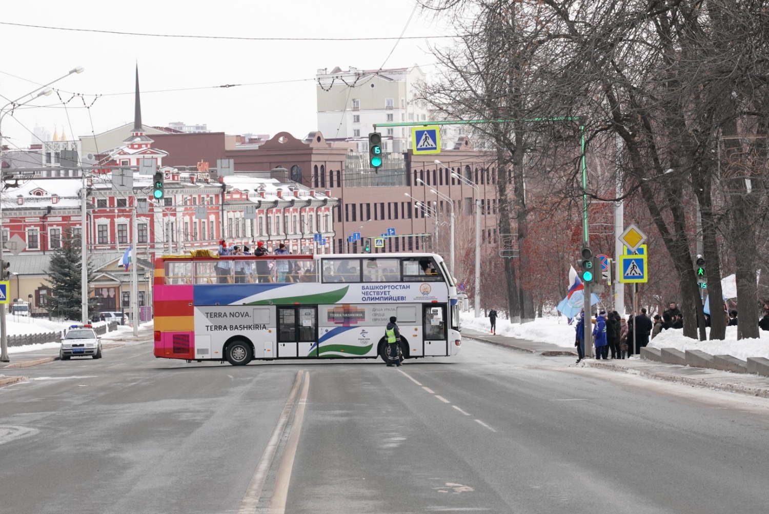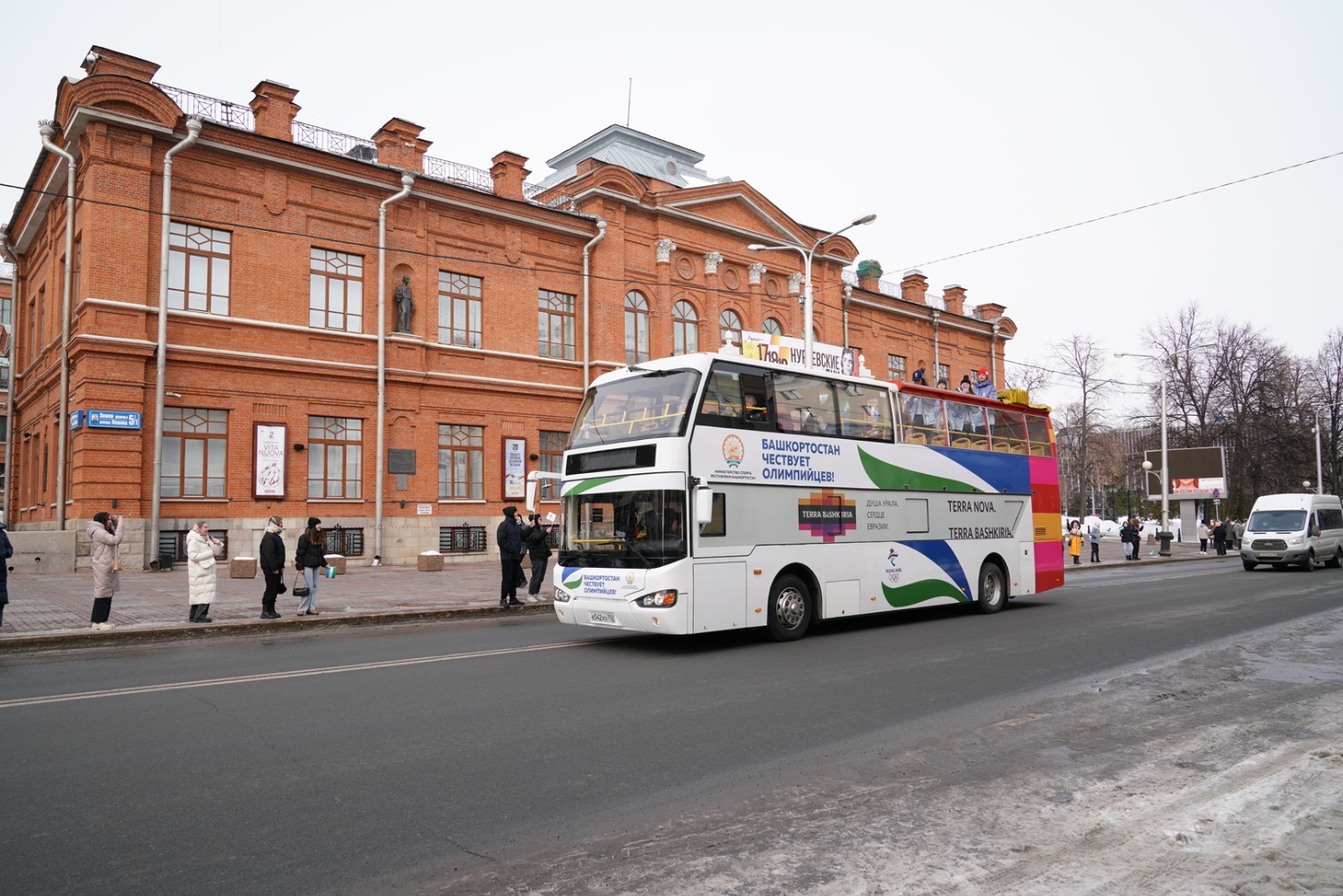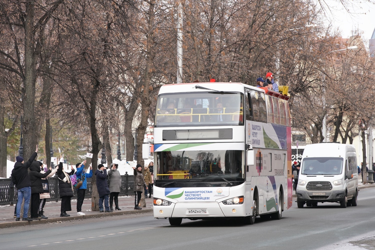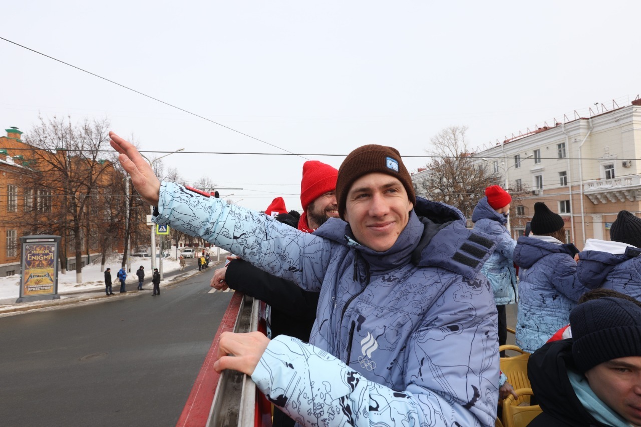 Автобус с нашими олимпийцами далее проследовал по улице Ленина на Советскую площадь, по пути следования наших спортсменов приветствовали жители Уфы.