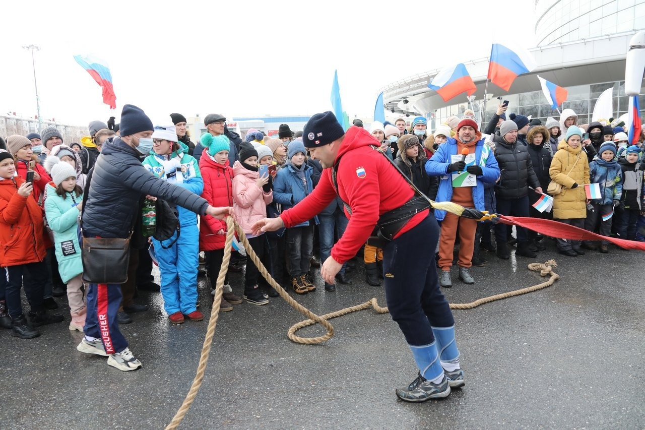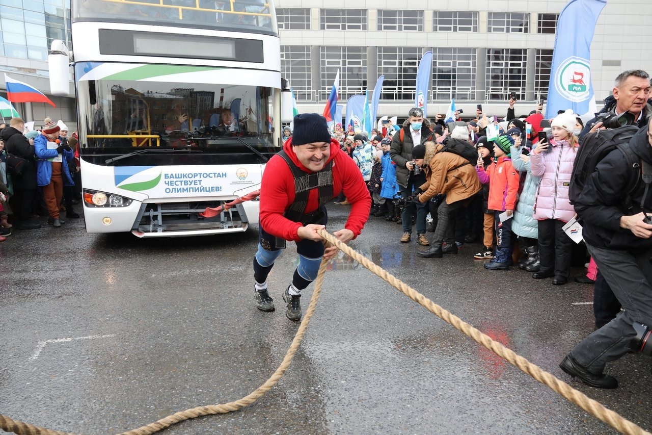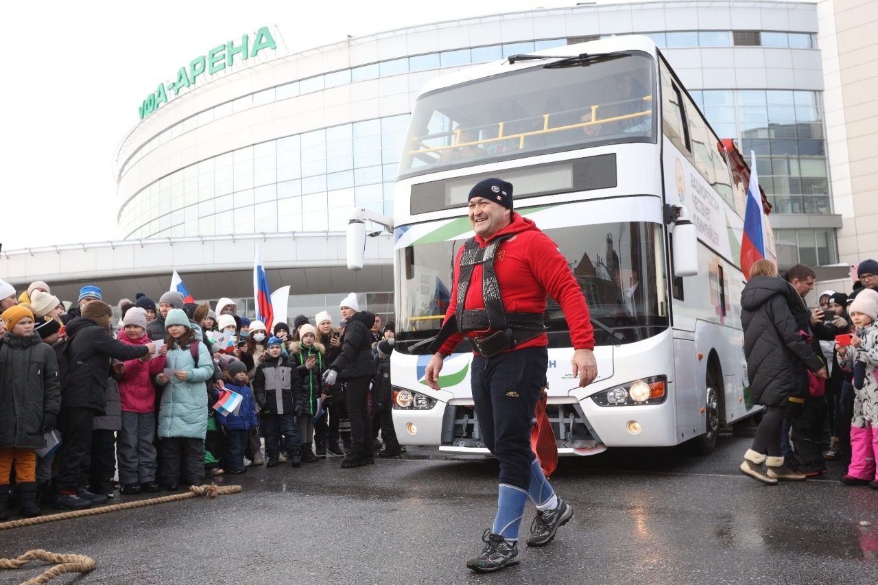 После того, как спортсмены разместились по своим местам, четырёхкратный победитель турнира «Самый сильный человек России» Эльбрус Нигматуллин протянул 20–тонный автобус на 35 метров под овации зрителей, собравшихся на площади.