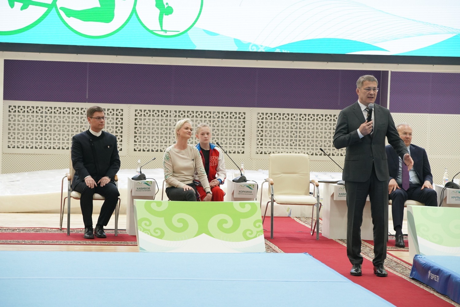 «Для нас сегодня очень важный и радостный день. Сегодня сбылась мечта. Хочу поблагодарить Светлану Хоркину и федерацию спортивной гимнастики за мудрые советы и подсказки во время строительства центра, которые нам очень помогли. Республика будет продолжать строить и другие такие прекрасные спортивные объекты. Мы построим большой Дворец борьбы, начнем строить летом Центр фехтования, приступаем к строительству Центра гребного слалома. Спорт играет очень важную роль в воспитании наших детей», - сказал Радий Хабиров.