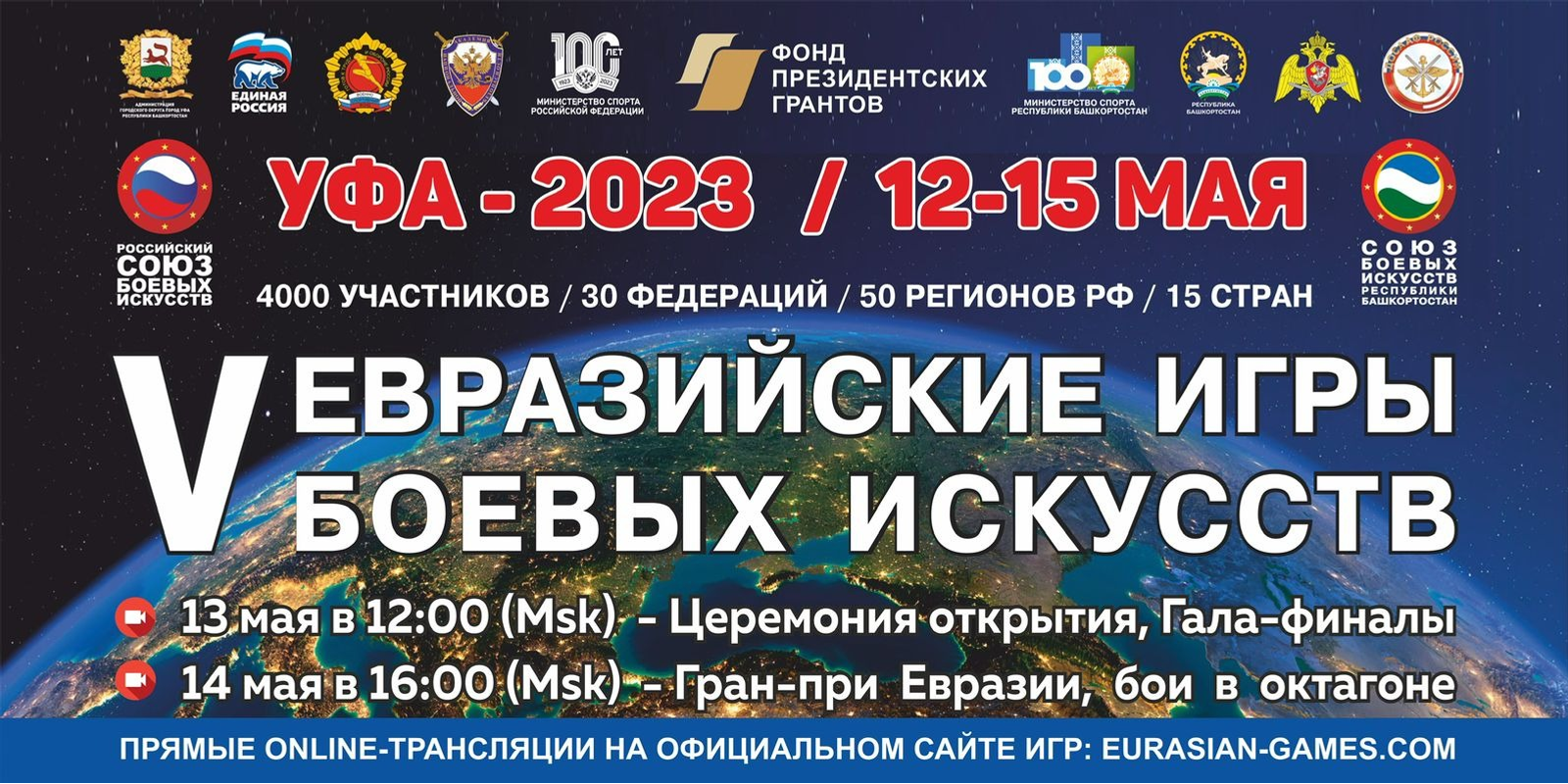 Открытие V открытых Евразийских игр боевых искусств состоится 13 мая. 14 мая под эгидой международной всестилевой бойцовской лиги пройдёт гран-при Евразии. В нём примут участие титулованные бойцы, ведущие представители различных видов единоборств из регионов России и зарубежных стран. Они сразятся за чемпионский пояс.