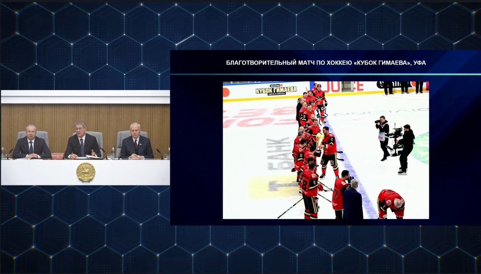 С приветственным словом на льду выступили и. о. вице-премьера правительства Башкирии – министр спорта Руслан Хабибов, прославленный хоккеист Вячеслав Фетисов и сын Сергея Гимаева – хоккеист Сергей Гимаев.