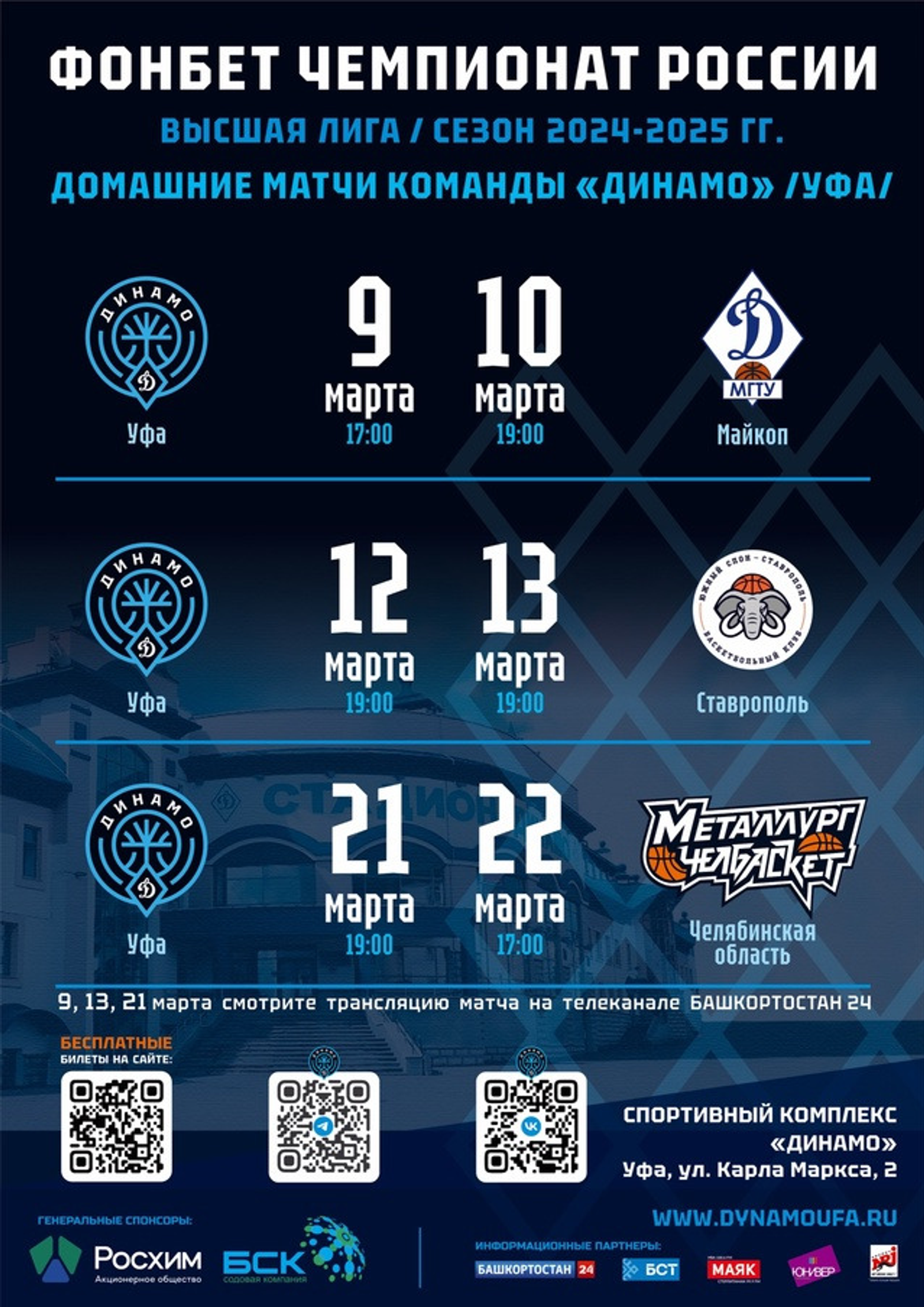 С 9 по 22 марта уфимский баскетбольный клуб «Динамо» проведет серию домашний матчей.