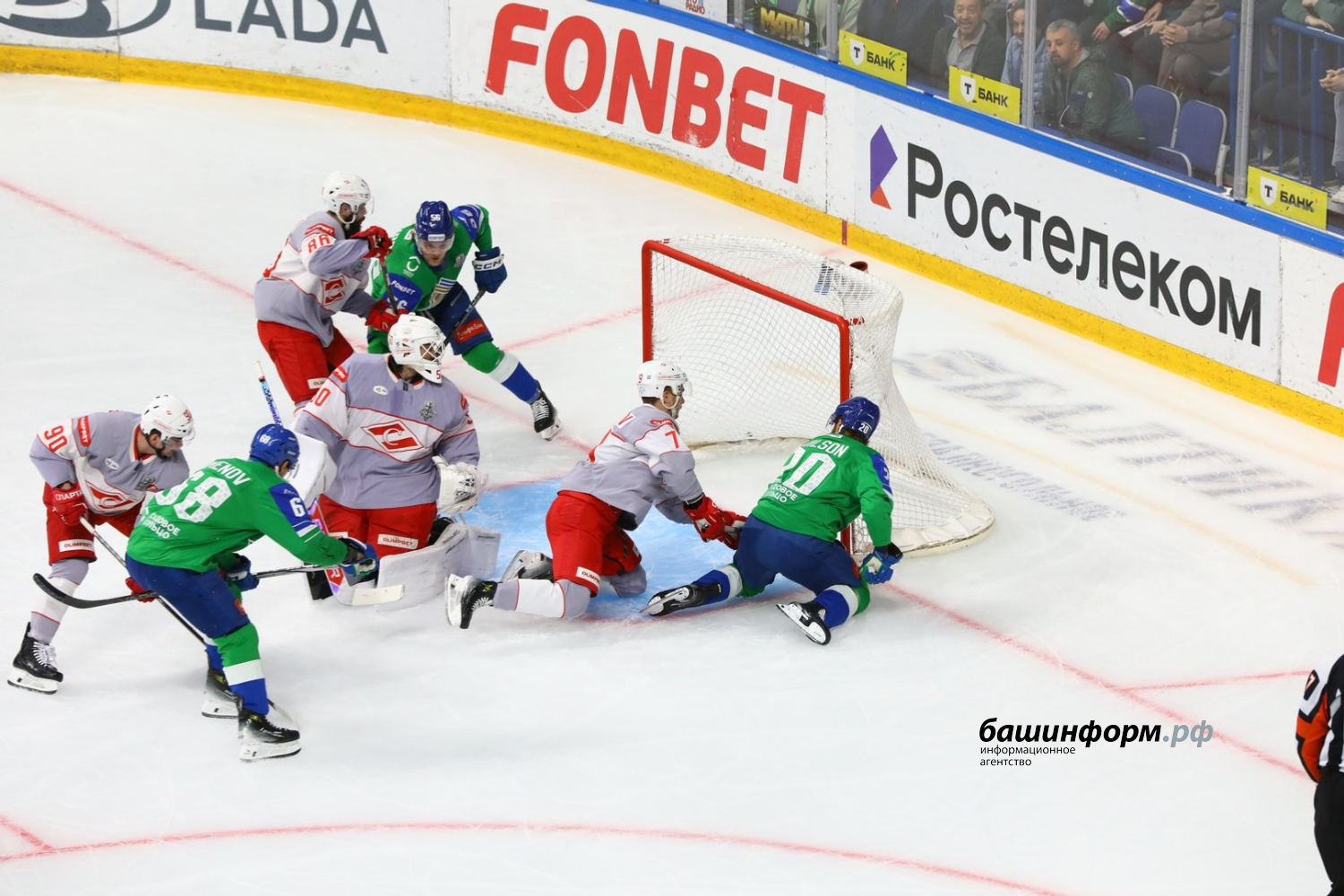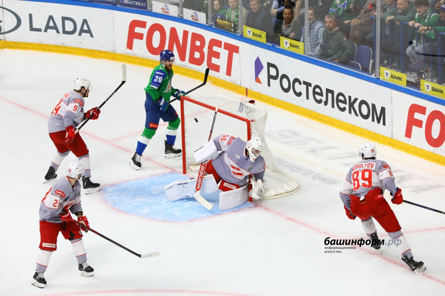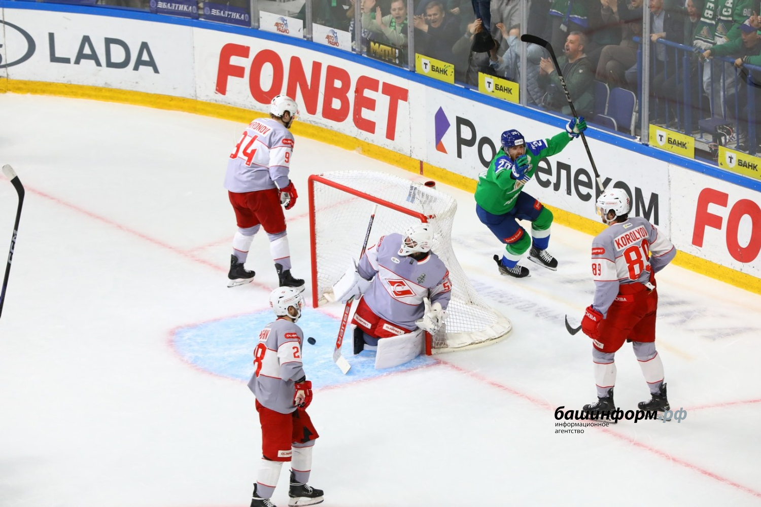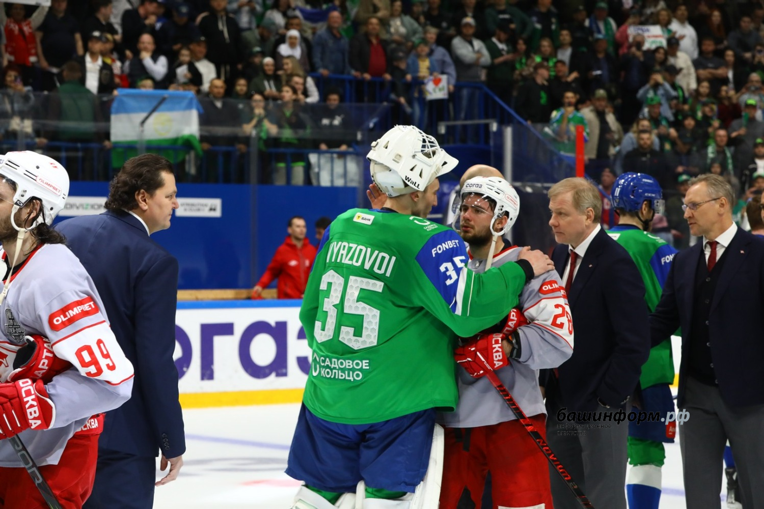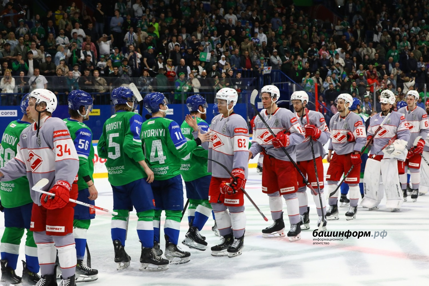 «Салават Юлаев» в Уфе победил «Спартак» и вышел в полуфинал Кубка Гагарина. Игра в эти минуты завершилась со счетом 3:2.