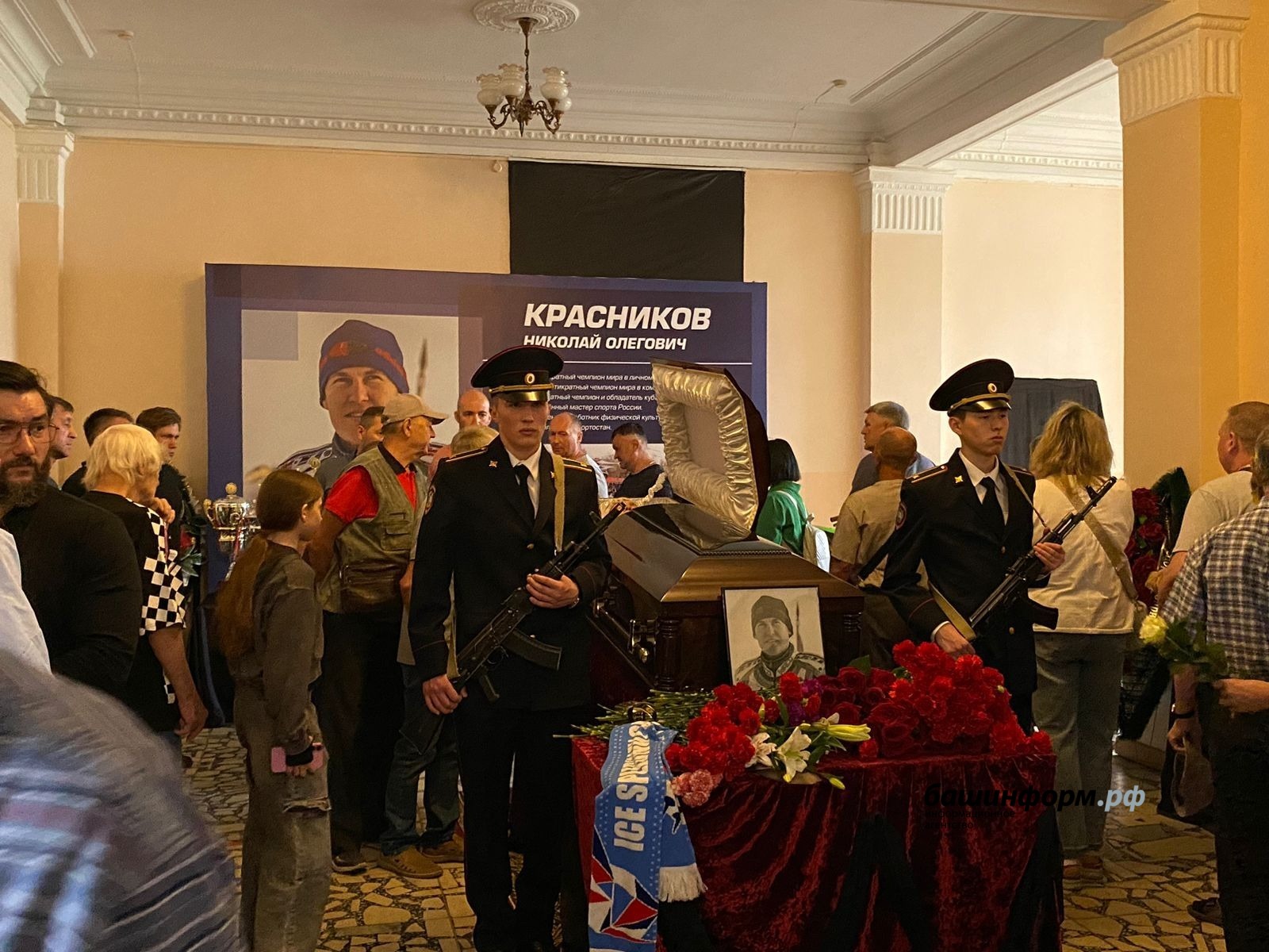 В Уфе прошла траурная церемония прощания с 20-кратным чемпионом мира по мотогонкам на льду Николаем Красниковым. Проводить его в последний путь в спортшколу имени Николая Гастелло пришли сотни людей. Коллеги и его поклонники отмечают, что смерть Красникова – большая потеря для всей Башкирии.