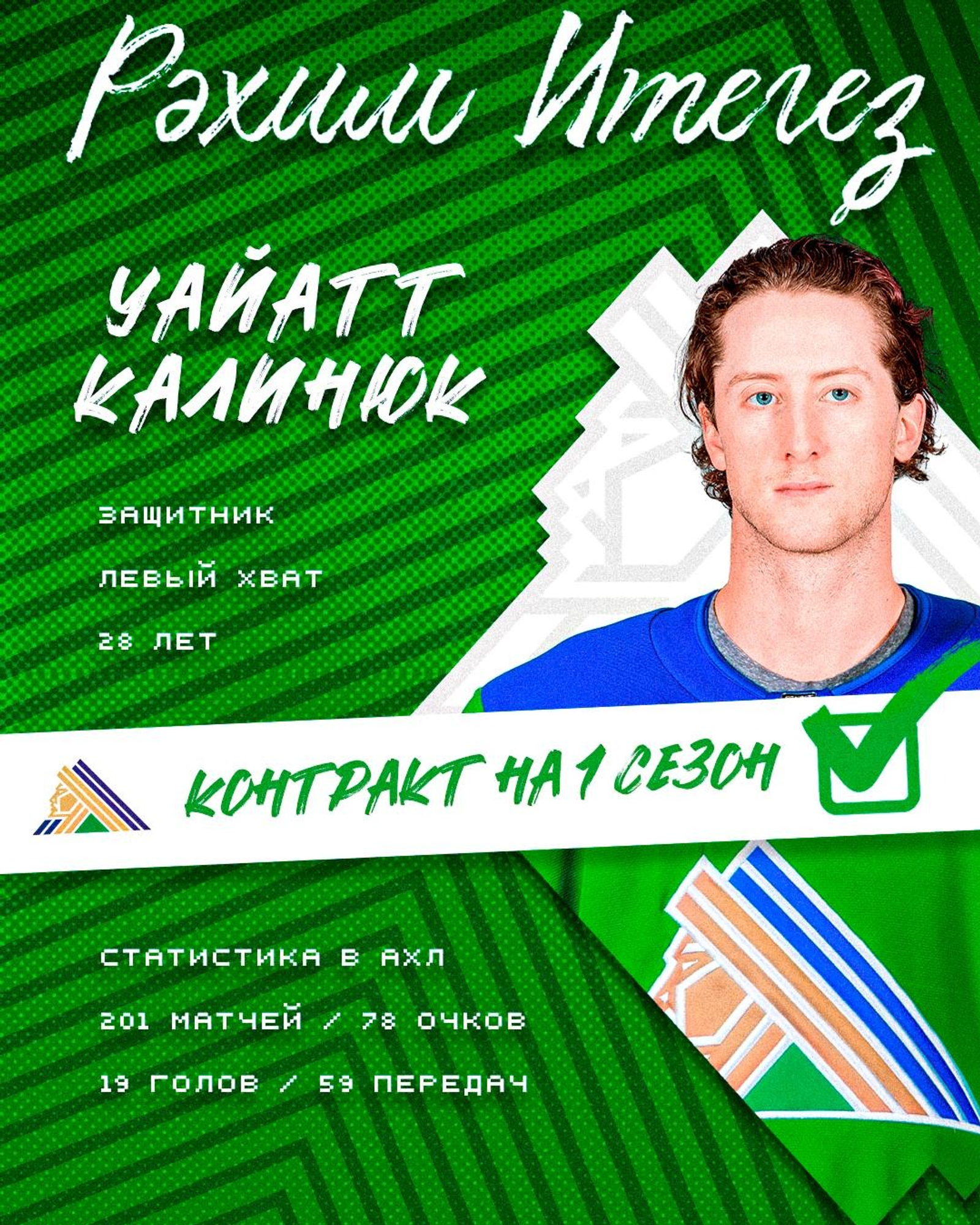 Напомним, Калинюк перешёл в «Салават Юлаев» в результате обмена из «Ак Барса». Почти всю карьеру Уайатт провёл за океаном. Играл за «Линкольн Старз» (2014-2015), «Блумингтон Тандер» (2015-2017), Университет Висконсина (2017-2020), «Рокфорт АйсХогс» (2020-2022), «Чикаго Блэкхокс» (2020-2022), «Эбботсфорд Кэнакс» (2022-2023), «Хартфорд Вулф Пэк» (2022-2023), «Спрингфилд Тандербёрдс» (2023-2024), «Пеликанс» (2024-2025).