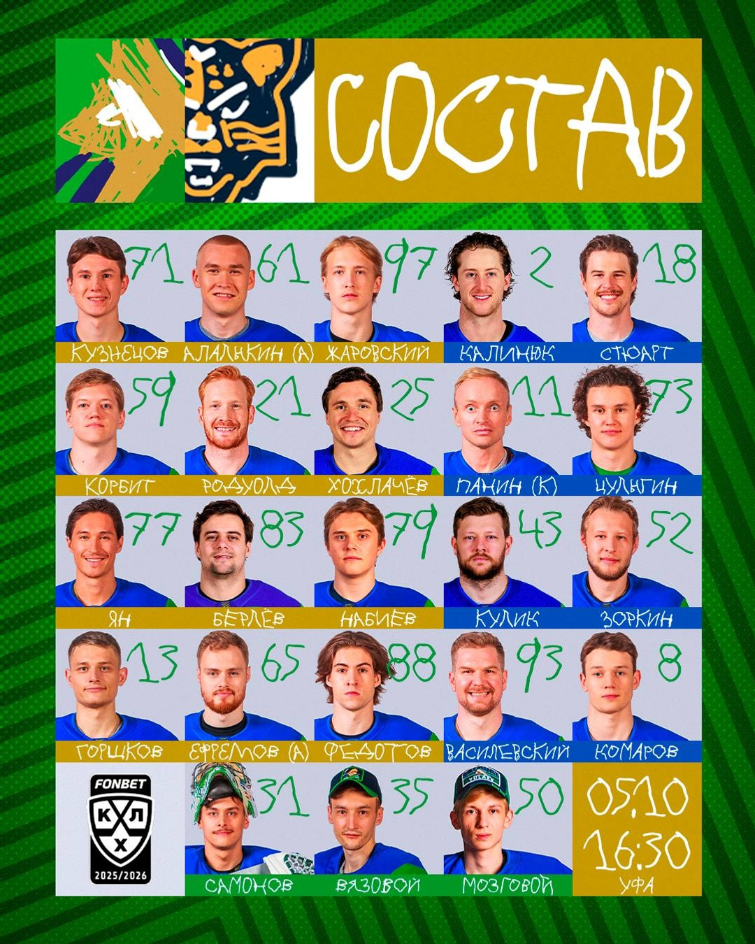 Сегодня «Салават Юлаев» проведёт заключительный матч второй домашней серии КХЛ против «Сочи». В уфимской команде дебютируют форвард Антон Берлёв и защитник Евгений Кулик. Также в состав вернулся после травмы нападающий Денис Ян.
