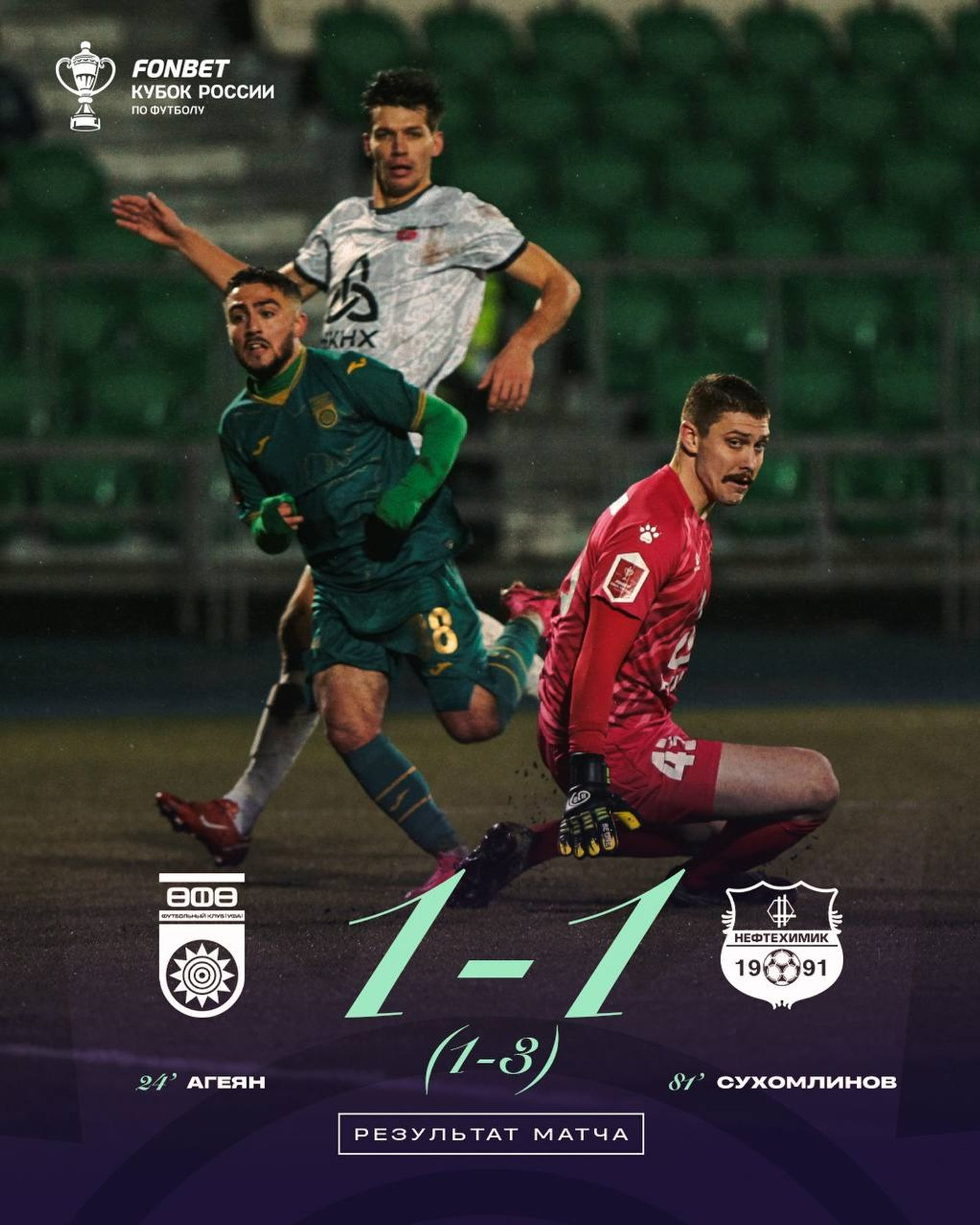 В серии пенальти хозяева забили только один мяч — его автором стал Шамиль Исаев. Никита Мацхарашвили и Алан Хабалов промахнулись. В составе «Нефтехимика» не смог забить только Андрей Никитин, в то время как Давид Кокоев, Ислам Машуков и Иван Бобер реализовали свои попытки. Итоговый счет — 3:1 в пользу «Нефтехимика», который в следующем раунде встретится с «Ростовом» из Премьер-лиги.