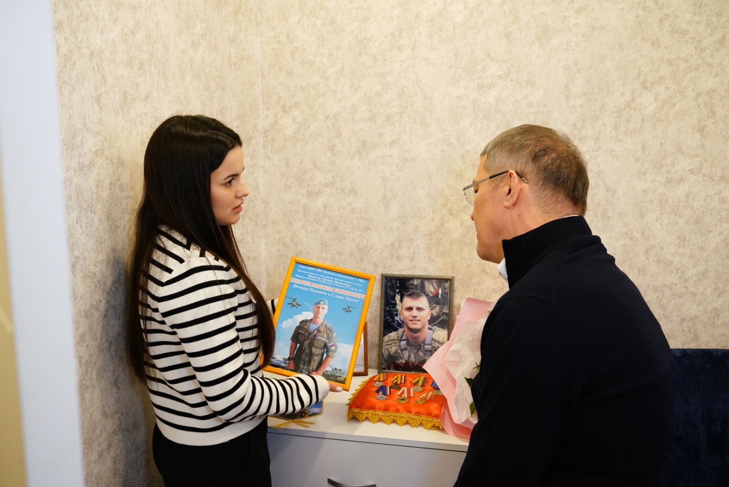 Во время общения с родными погибшего героя, его мамой Натальей Петровной и супругой Марией, Радий Хабиров поинтересовался, какую помощь они получили и получают от государства, от администрации города и района.