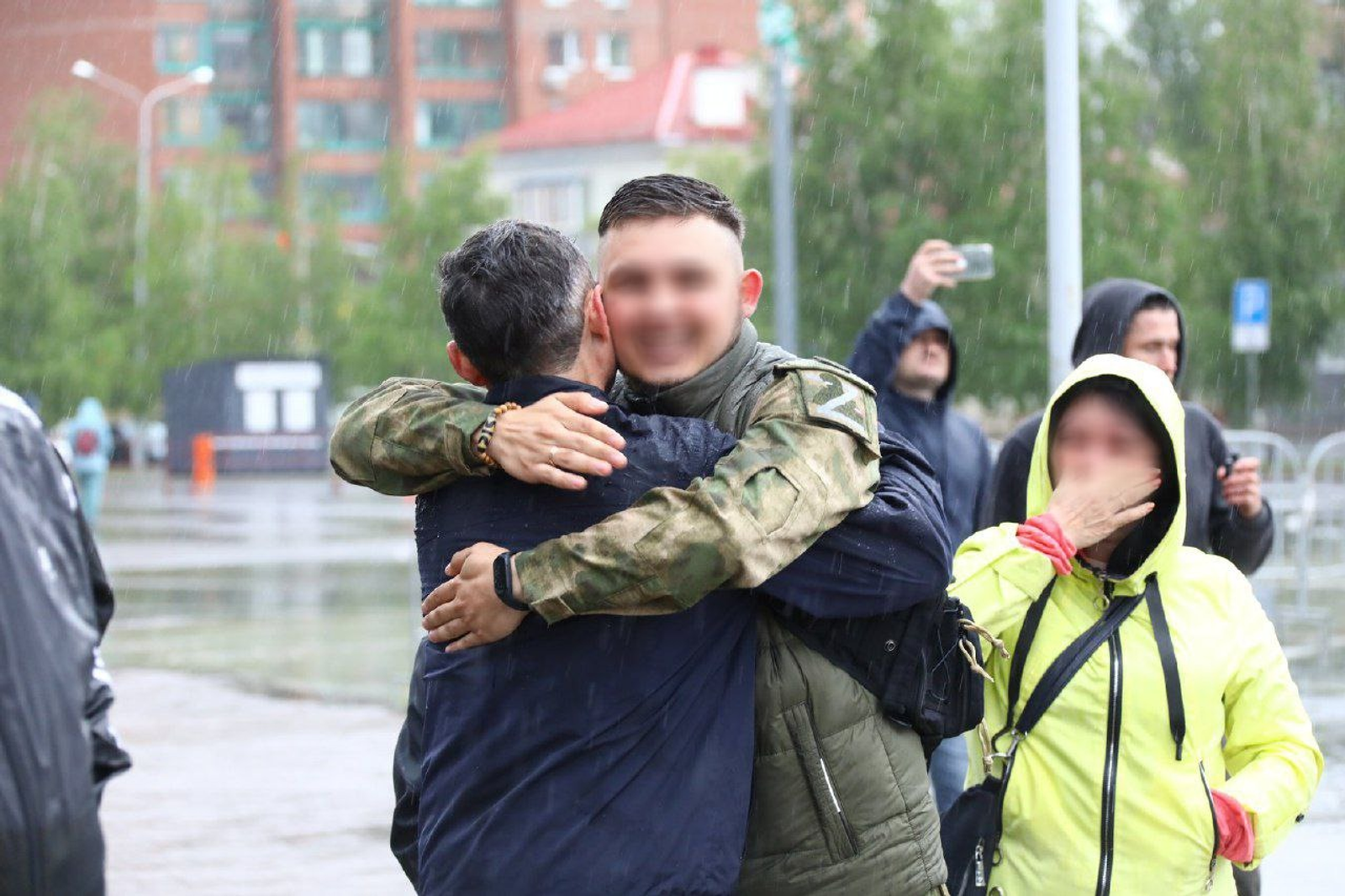 «Сынок, ты там давай поосторожнее, будь внимателен, береги себя», — обнимает мама одного из бойцов. «Мать, ну ты что, наш парень взрослый мужик. Проходил уже «горячие» точки», бывалый он», — тут же останавливает женщину отец солдата.