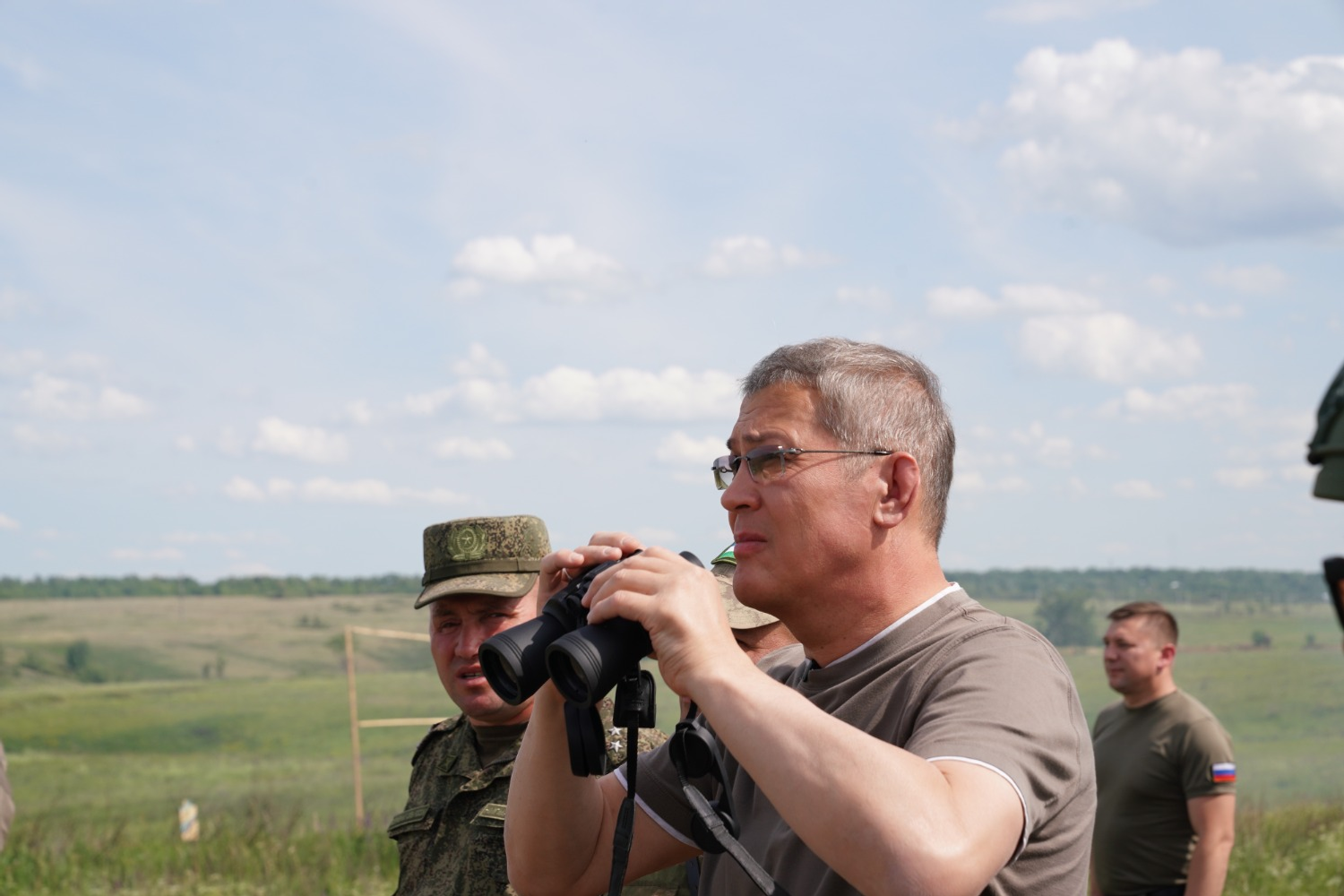 Время за общением с бойцами и съемками проходит быстро, командир полка по рации сообщает, что едет Глава республики. Он докладывает Радию Хабирову, что на данном полигоне учения проходят бойцы батальона имени Тагира Кусимова.