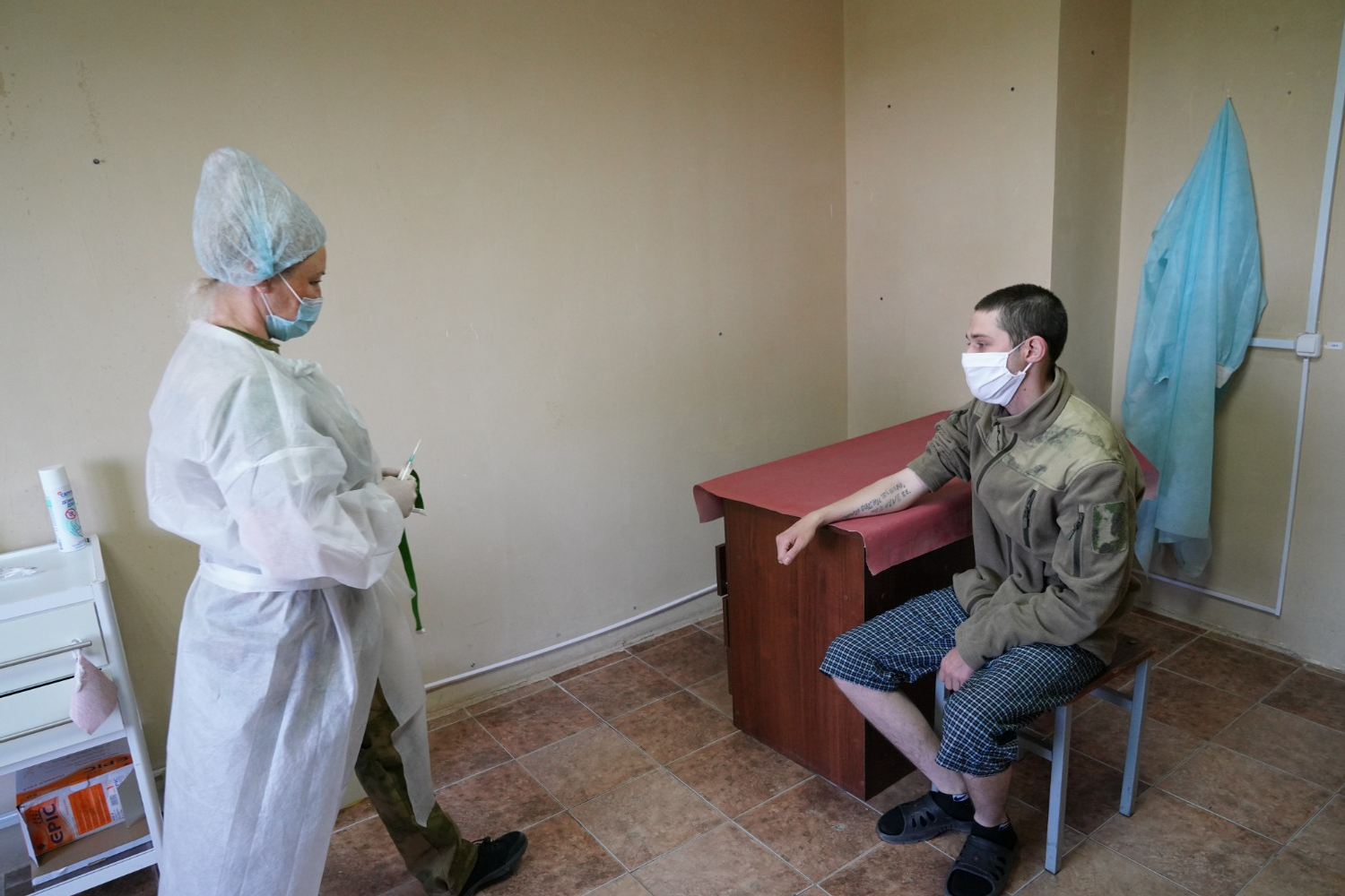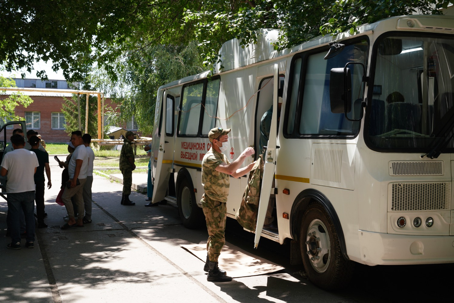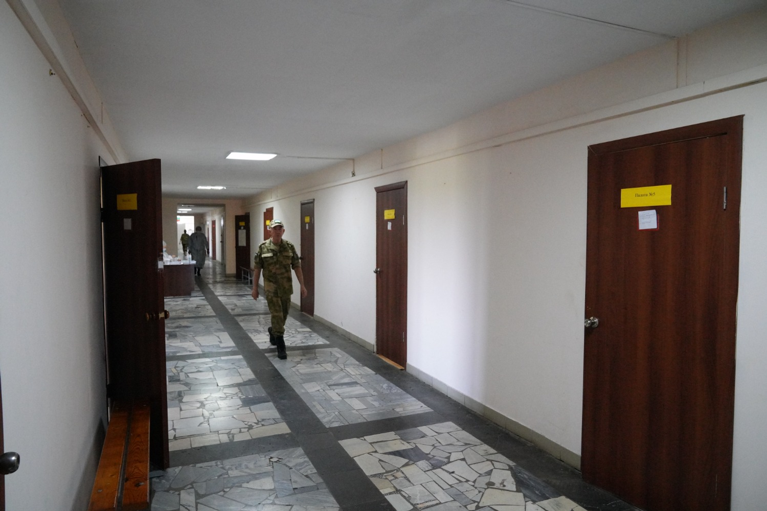 Советник Главы Башкортостана по вопросам взаимодействия с военнослужащими Алик Камалетдинов советует нам до отъезда на полигон посетить медсанчасть, которая организована в одной из казарм. Там организовали палаты и кабинеты для углубленной диспансеризации бойцов. Внизу стоит мобильный медицинский пункт, который приехал из республики вместе с врачами и медсестрами.