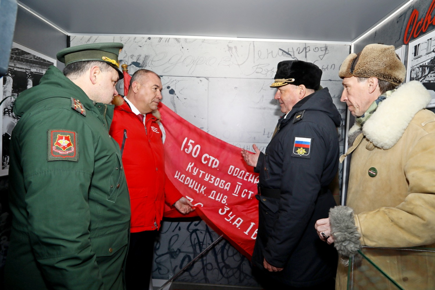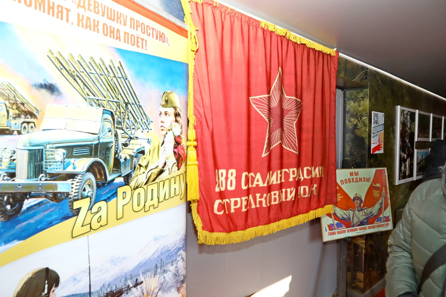 На перроне собравшиеся могут посмотреть экспозицию «Этих дней не смолкнет слава», где представлена боевая техника времен Великой Отечественной войны и новейшие образцы, задействованные в том числе на специальной военной операции. По словам руководителя акции, начальника Черноморского высшего военно-морского училища имени П.С. Нахимова, контр-адмирала Александра Гринкевича, в тематических вагонах поезда Центральным музеем Вооруженных сил представлена точная копия Знамени Победы. Можно подойти, потрогать, поддержать эту святыню в руках, узнать историю: как, кем и когда был водружен штурмовой флаг, ставший знаменем Победы над Рейхстагом. Представлены копия акта капитуляции фашистской Германии и все награды, которыми награждались наши красноармейцы в годы Великой Отечественной войны. У многих собравшихся вызывает интерес экспозиция оружия всех видов и родов наших Вооруженных сил.