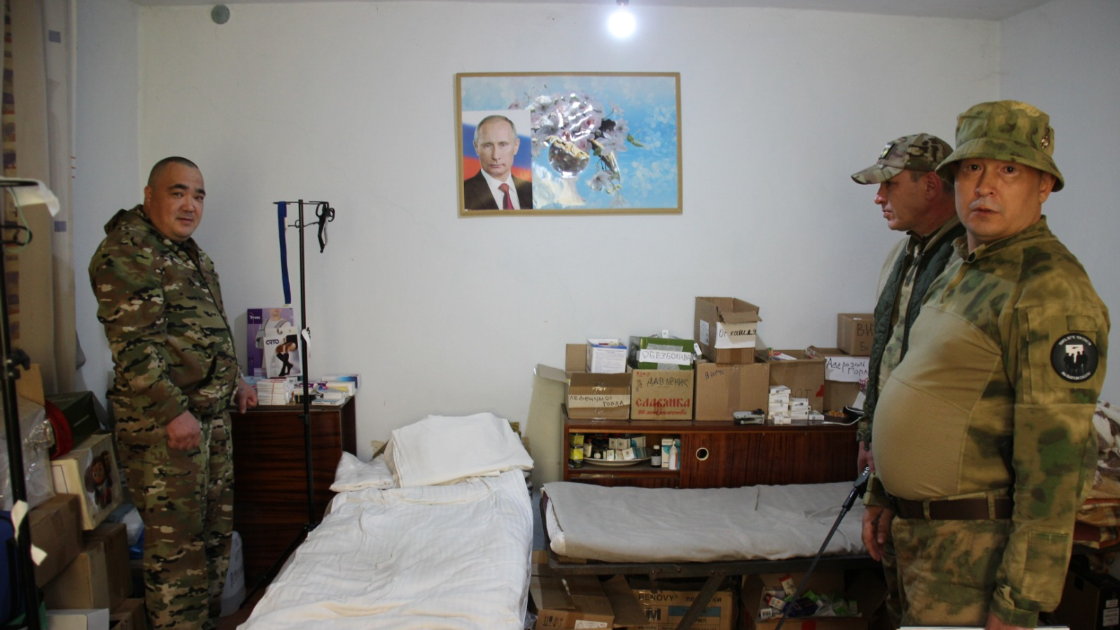 Примечательно, что солдаты прикрепили на стены медпункта детские рисунки, присланные из республики с гумконвоями, листки с мусульманскими молитвами (на русском языке) и иконы, к которым могут обратиться все воины вне зависимости от вероисповедания, а также чёрно-белые ксерокопии фотографий момента посещения башкирских воинов Главой Республики Башкортостан Радием Хабировым. На снимках рядом с Главой республики и руководителем его администрации Максимом Забелиным запечатлены «Док», «Данди» и «Лепила», а также фельдшеры «Хирург» и «Знахарь», с которыми корреспондент «Башинформа» познакомился в прошлом году.