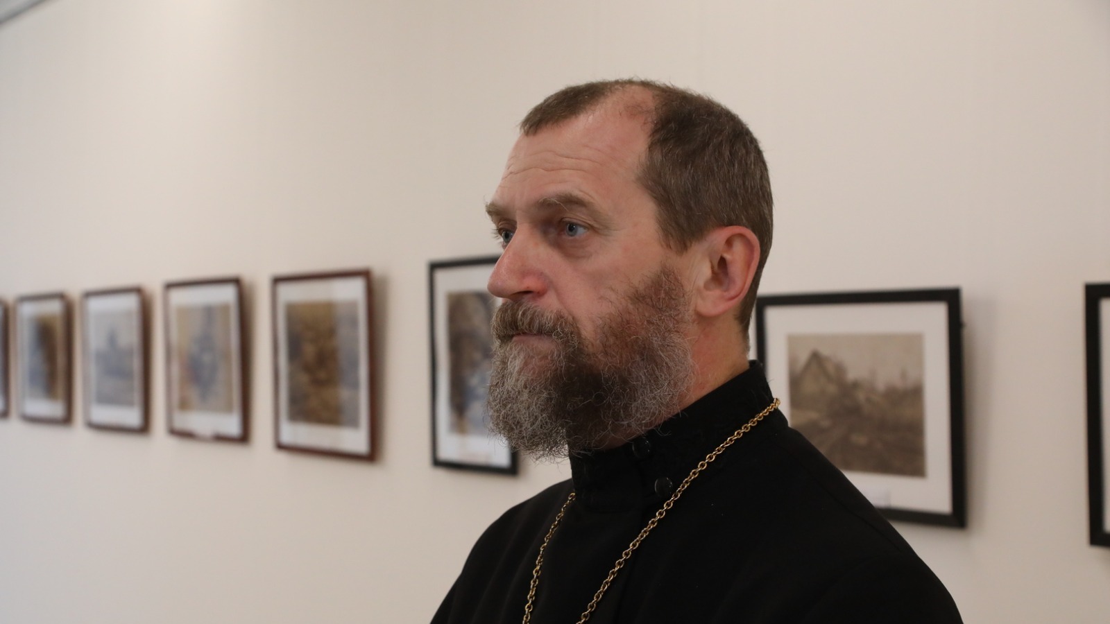 «Два года назад мы организовали проект "Арт-Поддержка". На выставке были представлены картины Саши Скорнякова, карикатуры Камиля Бузыкаева и других мастеров. Отец Виктор в это время уже находился в зоне СВО. Я связался с ним и попросил его прислать свои рисунки. Но его скромность не знает границ. Прислал буквально восемь работ, — сказал Дмитрий Глушко. — Сегодня мы счастливы видеть более полусотни графических рисунков Виктора Евгеньевича. И это не все его работы, их на самом деле очень много. У него очень много акварели. Отец Виктор любит жизнь и многие его картины, выполненные в богатой цветовой палитре, показывают, как прекрасно мироздание. Но сегодня на выставке монохром. Тем не менее видим очень интересные и живые работы. Вот обратите внимание на рисунок с УАЗом, к которому прицеплена пушка. Надеюсь, что эта „буханка“ из числа тех, которые неоднократно отправлял на передовую Российский союз ветеранов Афганистана. К тому же отец Виктор талантлив не только в графике. Как вы сегодня убедились, он поэт, композитор и певец. Кроме того, он ведёт активную общественную жизнь, работает с молодёжью, привлекает их к спорту, учит патриотизму. Очень многогранный человек».