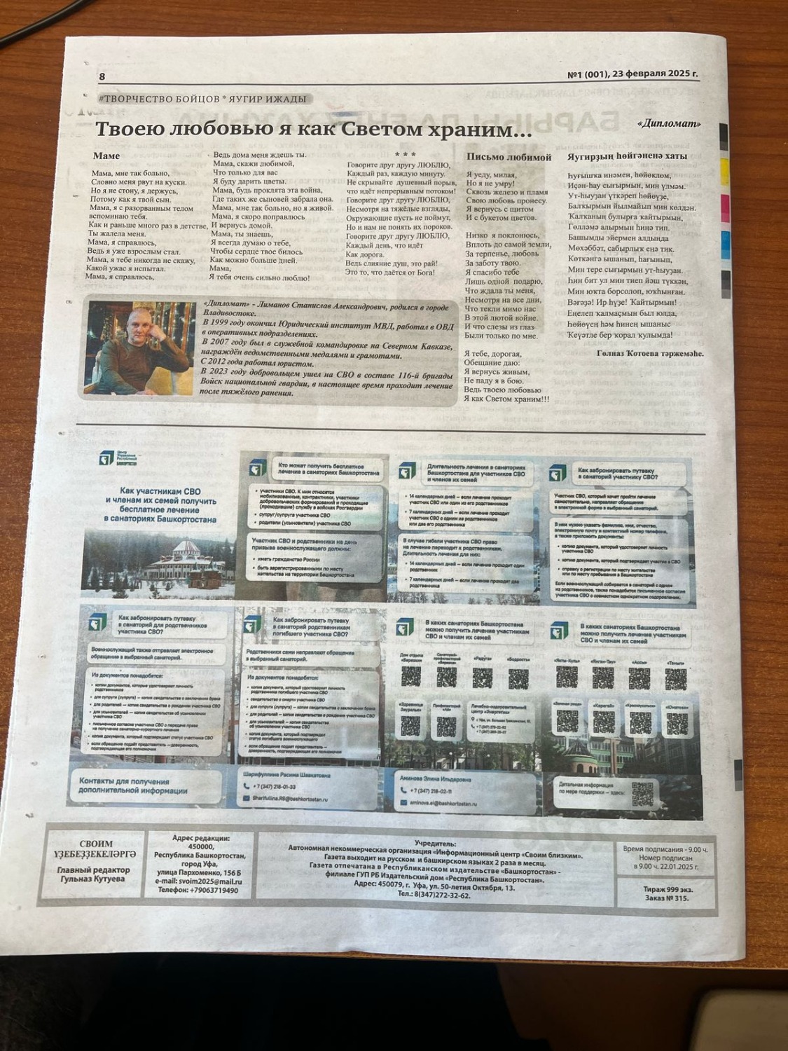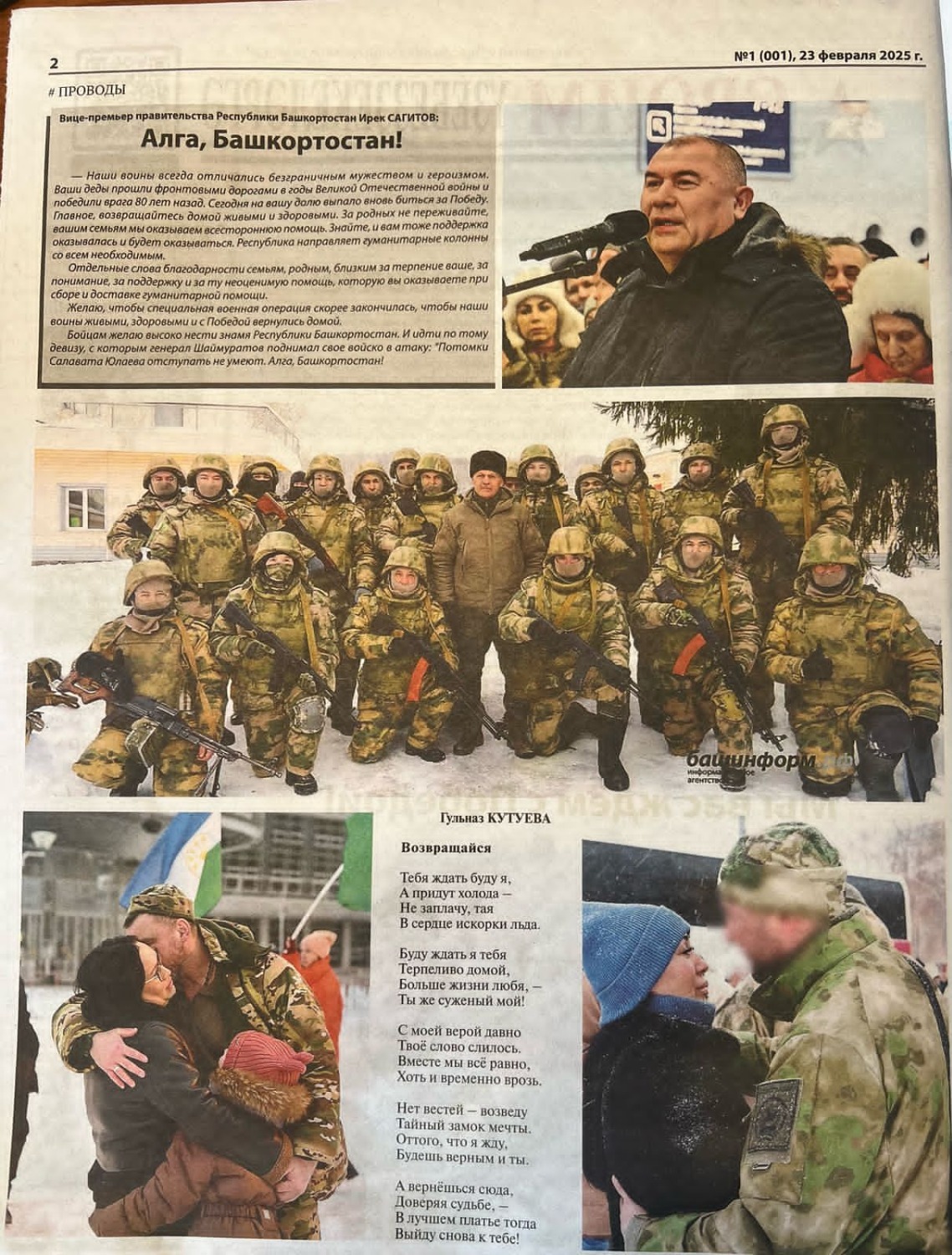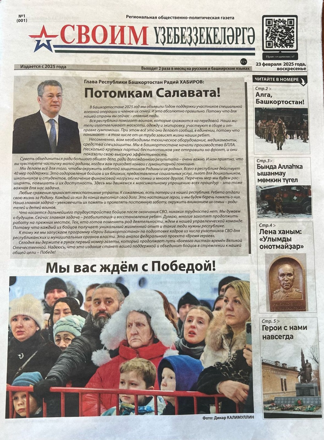 «В Башкортостане 2025 год мы объявили Годом поддержки участников специальной военной операции и членов их семей. И это абсолютно правильно. Потому что для нашей страны вы сейчас — главные люди, — говорится в обращении Главы республики. – Сегодня вы держите в руках первый номер газеты, который продолжает путь „Боевого листка“ времен Великой Отечественной. Надеюсь, что это издание станет вашей поддержкой и объединит бойцов в стремлении к нашей общей цели — Победе!»