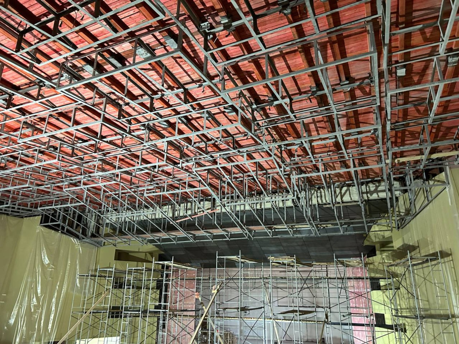 «Строители приступили к подготовительным работам для монтажа декоративных акустических плит на потолок. Плиты не только придадут залу эстетичный вид, но и улучшат звуковое качество. Все это особенно важно для проведения концертов, спектаклей и других мероприятий», — сообщает пресс-служба ведомства.