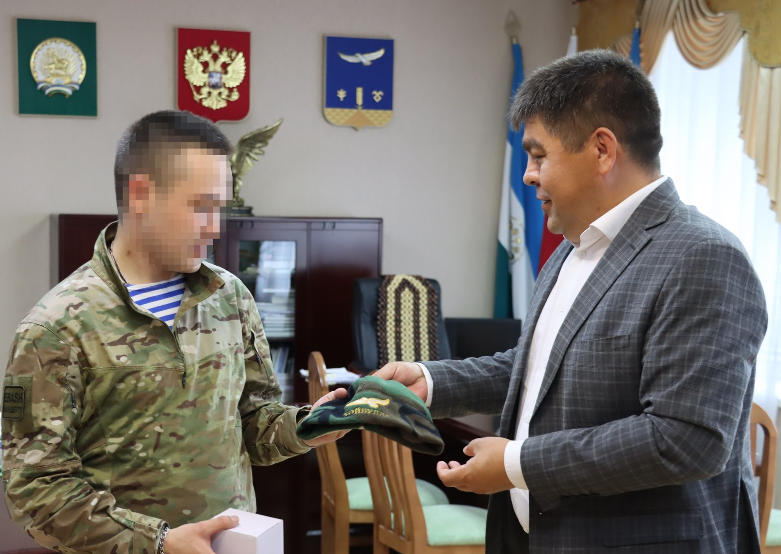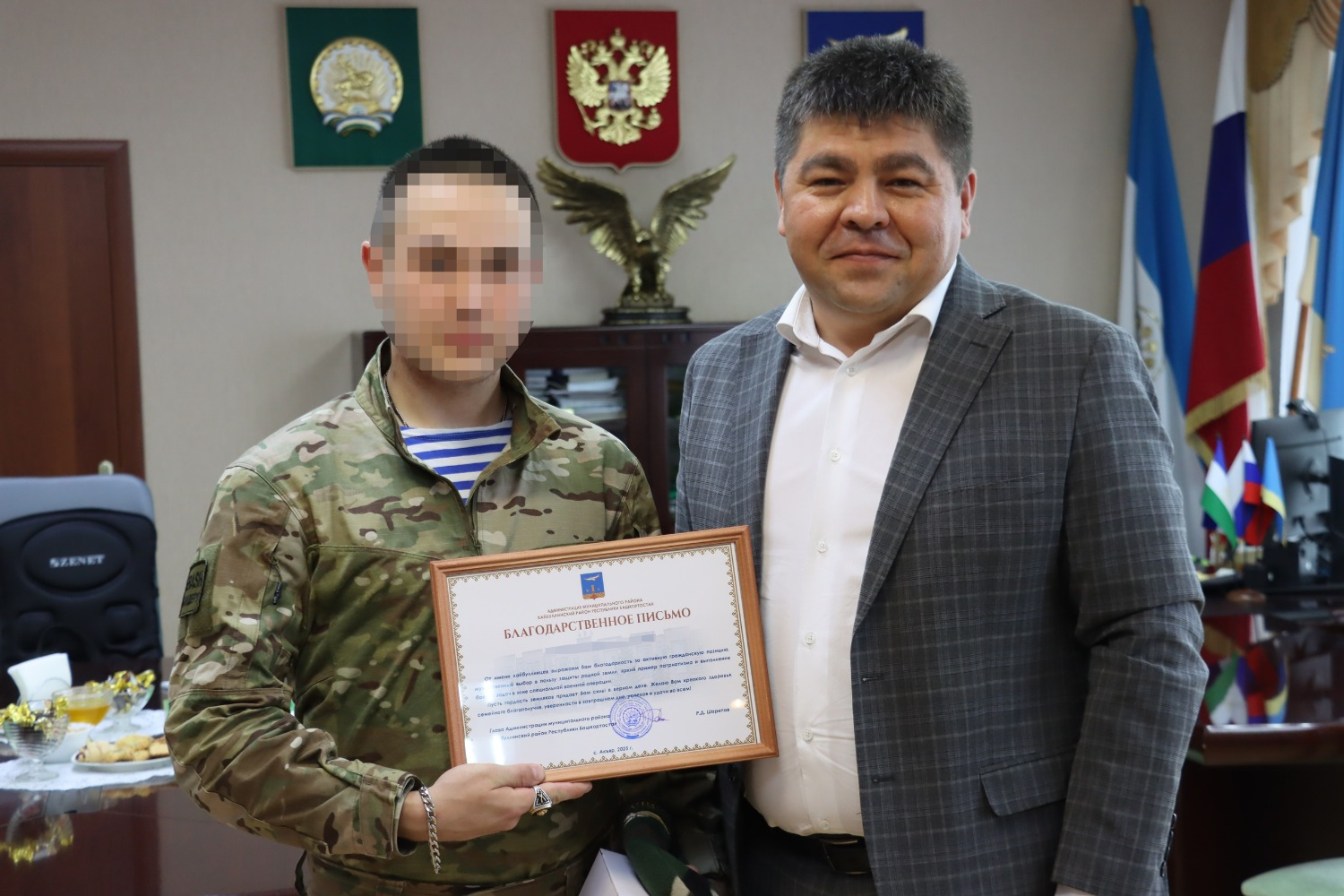 Глава Хайбуллинского района Башкирии Рустам Шарипов встретился с участником СВО с позывным «Гроза». Руководитель муниципалитета в соцсетях рассказал, что боец вернулся в отпуск в родное село.