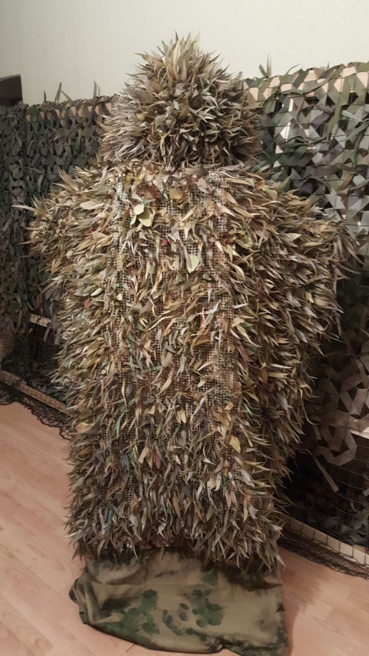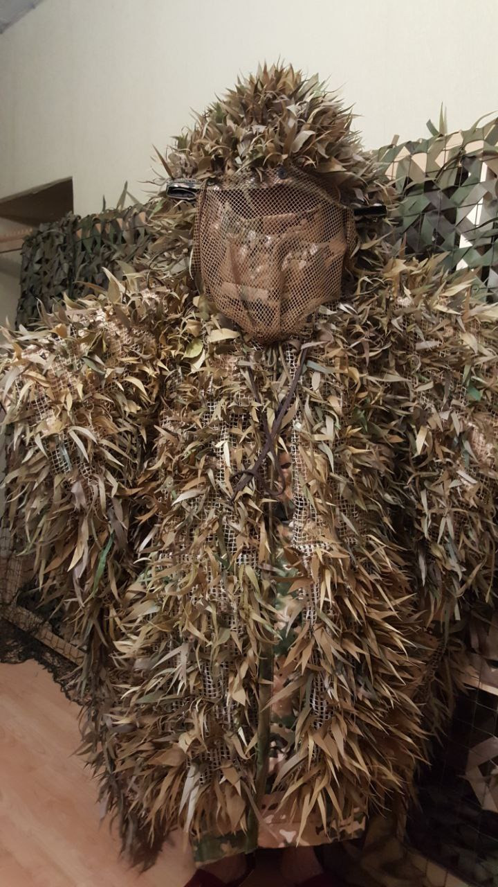 Изготовление снайперских костюмов в чем-то напоминает производство маскировочных сетей, но намного более сложно и кропотливо. Основу составляет сетка с ячейками размером сантиметр на сантиметр. К ним крепятся вырезанные вручную лепестки спанбонда разного размера, цвета и формы.