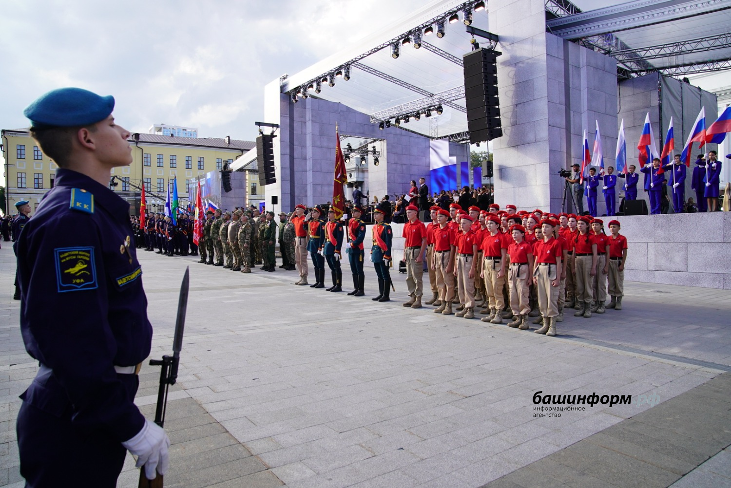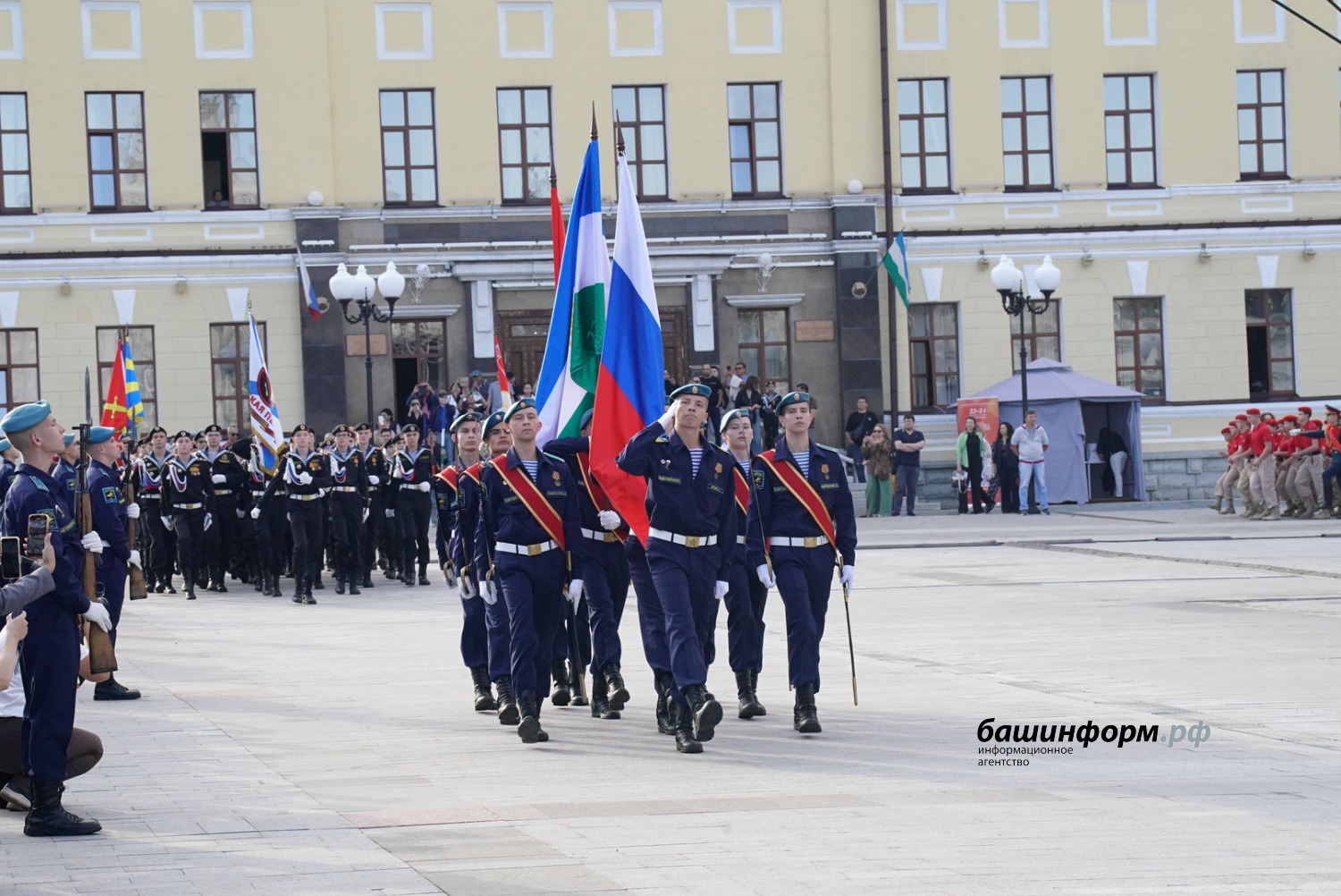 Торжественным маршем прошли воспитанники Региональной общественной организации морских пехотинцев «Витязь», лучшие представители регионального отделения Юнармии Башкирии. Знамена гордо держали в своих руках кадеты-отличники Уфимской школы-интерната с первоначальной лётной подготовкой им. дважды Героя Советского Союза Мусы Гареева. Кадеты с гордостью продолжают традиции своих отцов и дедов. Также в марше приняли участие ученики специальных классов им. Героя России Минигали Шаймуратова – шаймуратовцы, которые ежегодно на Советской площади принимают присягу со словами «Потомки Салавата отступать не умеют!». На парад были приглашены ветераны Афганистана и Чечни. Флаг Российской Федерации несли известные спортсмены, чемпионы Башкирии.