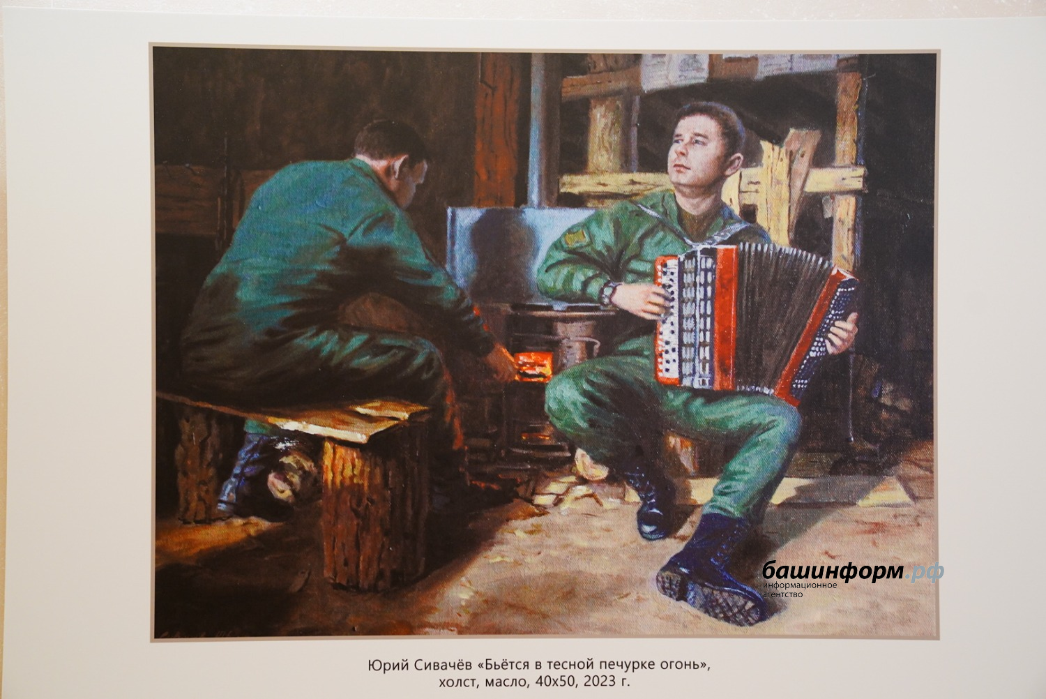 Ряд работ - это этюды, выполненные непосредственно в зоне СВО. Большой интерес вызывают портреты воинов, волонтеров, добровольцев, ветеранов. В передвижной экспозиции представлены портреты поэта-фронтовика Сергея Лобанова, погибшего водителя писателя Захара Прилепина Александра «Злого» Шубина, участники СВО из Башкирии – певец Альфир Заманов, актер Ильнур Сафаров, артисты Фларид и Фидан Биргалины.