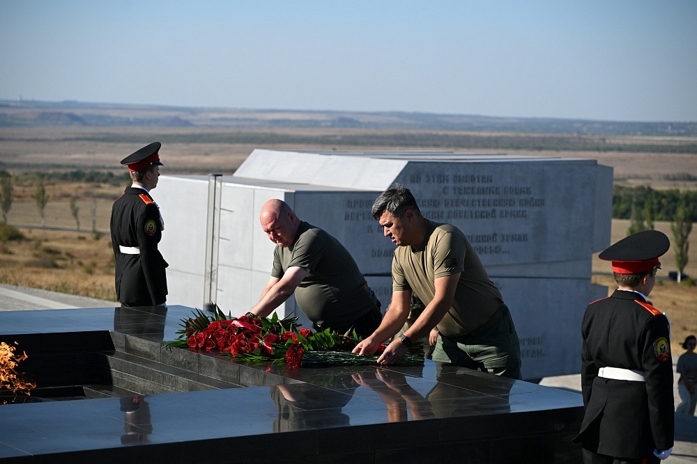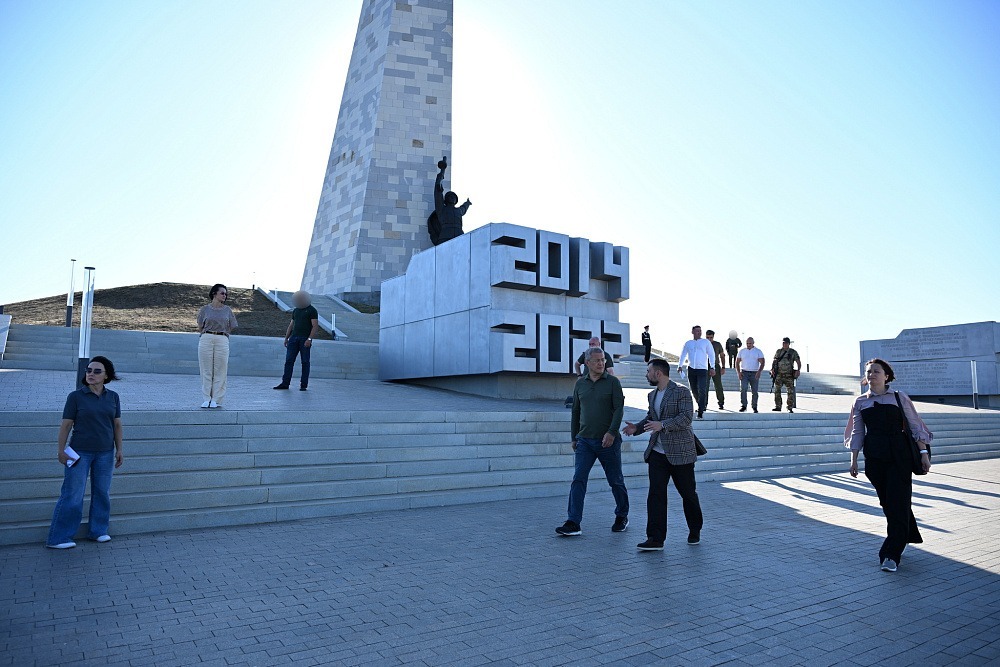Глава Башкирии Радий Хабиров и руководитель Донецкой Народной Республики Денис Пушилин возложили цветы к Вечному огню мемориального комплекса «Саур-Могила».