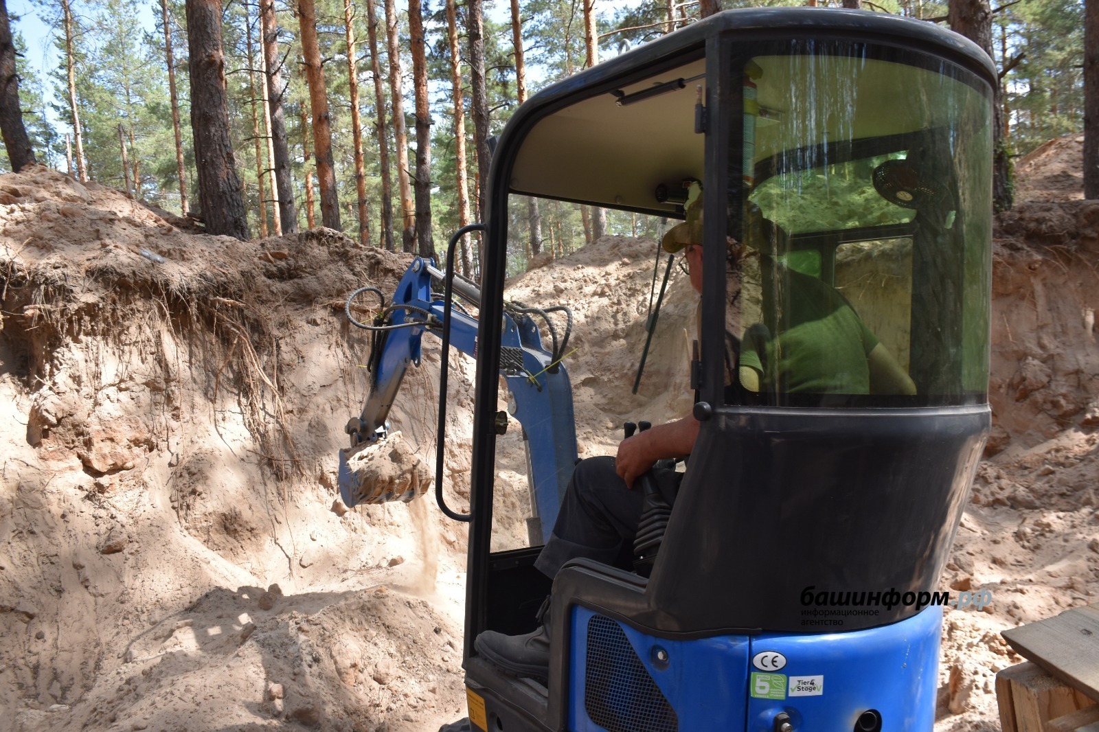 Строительная землеройная техника на резиновых траках и с узким ковшом предназначена для работы внутри помещений. Но строительный трудяга выполнил между деревьями немалый объём работ. За штурвалом — 55-летний военнослужащий с позывным «Байк» из деревни Новобайрамгулово Учалинского района.