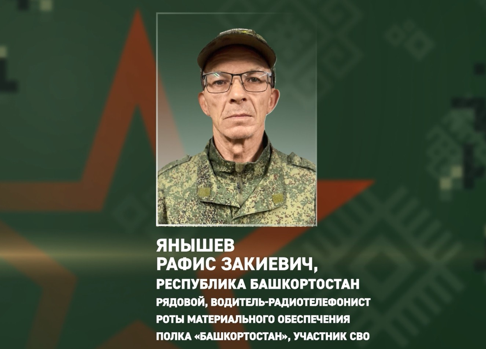 Ранее заместитель командира взвода разведроты имени Вафы Ахмадуллина мотострелкового полка «Башкортостан» Радмир Байдавлетов во время выполнения боевой задачи показал слаженную и эффективную работу.