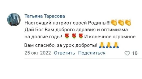 «Настоящий патриот своей Родины! Дай Бог Вам доброго здравия и оптимизма на долгие годы! И конечно, огромное спасибо «Башинформу» за урок доброты!» - написала под историей о 83-летней Зинфире Зайдуллиной Татьяна Тарасова.