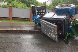 В Уфе на тротуаре опрокинулся на бок трактор